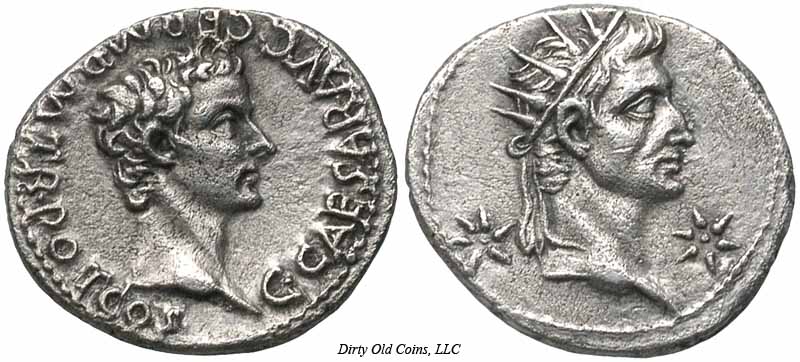 RIC 2, BMC 4, BN 4, C 11 Denarius Obv: CCAESARAVGGERMPMTRPOTCOS - Bare head right. Rev: No legend - Augustus radiate head right; star on either side. 37-38 (Lugdunum).