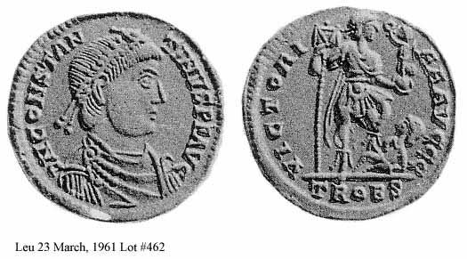 Rev: VICTORIAAAAVGGGG Exe: L/D/COMOB - Constantine III standing right, stepping on captive, holding labarum and Victory on globe. 407-408 (Lugdunum). $4,400 1/13/03.