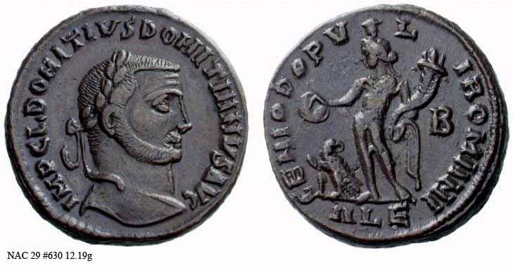 Rev: GENIOPOPVLIROMANI Exe: B/ALE - Genius standing left, holding patera and cornucopia; eagle to left. [Missing the "L" in the obverse legend]. c.295-296 (Alexandria).