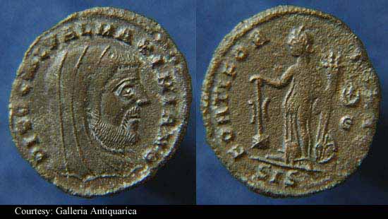 RIC 16 (VI, Heraclea) Antoninianus Obv: GALVALMAXIMIANVSNOBCAES - Radiate, draped and cuirassed bust right. Rev: CONCORDIAMILITVM Exe: H - Galerius standing right on left, receiving Victory on globe from Jupiter to right, holding scepter. 295-299 (Heraclea). RIC 19b (VI, Cyzicus) Antoninianus Obv: GALVALMAXIMIANVSNOBCAES - Radiate, draped and cuirassed bust right. Rev: CONCORDIAMILITVM Exe: K - Galerius standing right on left, receiving Victory on globe from Jupiter to right, holding scepter. 295-299 (Cyzicus). RIC 36 (VI, Carthago) Antoninianus Obv: GALVALMAXIMIANVSNOBC - Radiate, draped and cuirassed bust right. Rev: No legend - Wreath, VOT/X/FK within. 303 (Carthage). RIC 42b (VI, Ticinum) Antoninianus Obv: GALVALMAXIMIANVSNOBC - Radiate, draped and cuirassed bust right. Rev: No legend Exe: - Wreath, VOT/X within. c.299 (Ticinum). RIC 719 (V), C 127 Antoninianus Obv: GALVALMAXIMIANVSNOBCAES - Radiate, draped and cuirassed bust right. Rev: IOVIETHERCVLICONSCAES Exe: /XXI - Galerius standing right on left, receiving Victory on globe from Jupiter to right, holding scepter. (Antioch). $6 9/20/03.