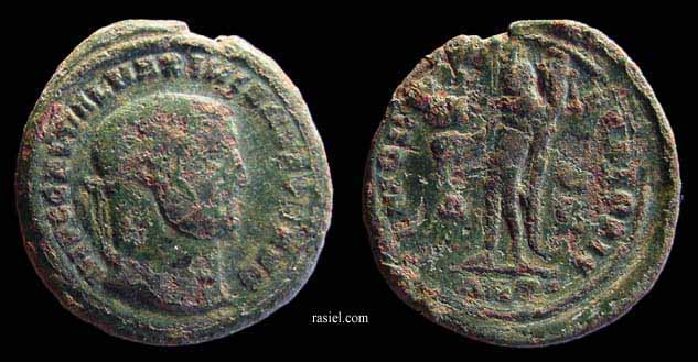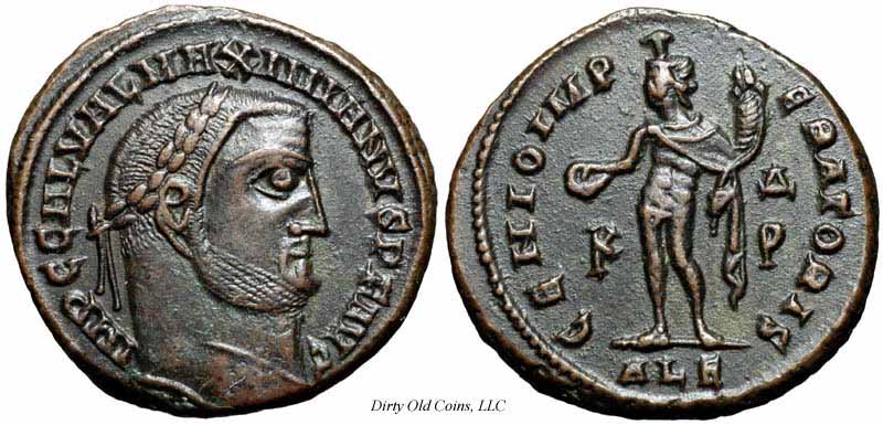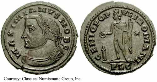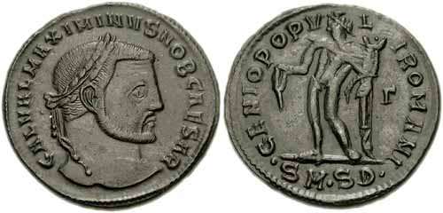 RIC 4b (Serdica) Follis Obv: GALVALMAXIMIANVSNOBCAES - Laureate head right. Rev: GENIOPOPVLIROMANI Exe: /•SM•SD• - Genius standing left, holding patera and cornucopia. RIC 9b (Cyzicus) Follis Obv: GALVALMAXIMIANVSNOBCAES - Laureate head right. Rev: GENIOAVGGETCAESARVMNN Exe: K - Genius standing left, holding patera and cornucopia. 295-296 (Cyzicus). RIC 12b (Serdica) Follis Obv: IMPCGALVALMAXIMIANVSPFAVG - Laureate head right. Rev: GENIOPOPVLIROMANI Exe: /SM•SD• - Genius standing left, holding patera and cornucopia. 305-306 (Serdica). RIC 13b (Serdica) Follis Obv: GALVALMAXIMIANVSNOBCAESAR - Laureate head right. Rev: GENIOPOPVLIROMANI Exe: /•SM•SD• - Genius standing left, pouring out patera and holding cornucopia. 305 (Serdica). RIC 15 (Londinium) Follis Obv: MAXIMIANVSNOBCAES - Laureate, cuirassed bust right. Rev: GENIOPOPVLIROMANI - Genius standing left, holding patera and cornucopia. c.300-303 (Londinium). RIC 15b (Alexandria) Follis Obv: GALVALMAXIMIANVSNOBCAES - Laureate head right. Rev: GENIOPOPVLIROMANI Exe: /ALE - Genius standing left, pouring out patera and holding cornucopia. c.294 (Alexandria). RIC 18b (Heraclea) Follis Obv: GALVALMAXIMIANVSNOBCAES - Laureate head right. Rev: GENIOPOPVLIROMANI Exe: HTB - Genius standing left, pouring out patera and holding cornucopia. 296-297 (Heraclea). RIC 18b (Heraclea) Follis Obv: GALVALMAXIMIANVSNOBCAES - Laureate head right. Rev: GENIOPOPVLIROMANI Exe: HTΔ - Genius standing left, pouring out patera and holding cornucopia. 296-297 (Heraclea). RIC 18b (Heraclea) Follis Obv: GALVALMAXIMIANVSNOBCAES - Laureate head right. Rev: GENIOPOPVLIROMANI Exe: HTE - Genius standing left, pouring out patera and holding cornucopia. 296-297 (Heraclea). RIC 20b (Cyzicus) Follis Obv: IMPCGALVALMAXIMIANVSPFAVG - Laureate head right. Rev: GENIOPOPVLIROMANI Exe: K - Genius standing left, pouring out patera and holding cornucopia. RIC 20b (Heraclea) Follis Obv: GALVALMAXIMIANVSNOBCAES - Laureate head right. Rev: GENIOPOPVLIROMANI Exe: HT - Genius standing left, pouring out patera and holding cornucopia. 302-303 (Heraclea). RIC 20b (Thessalonica) Follis Obv: GALVALMAXIMIANVSNOBCAES - Laureate head right. Rev: GENIOPOPVLIROMANI Exe: TS - Genius standing left, pouring out patera and holding cornucopia. 298-299 (Thessalonica). RIC 22b (Thessalonica) Follis Obv: GALVALMAXIMIANVSNOBCAES - Laureate head right. Rev: GENIOPOPVLIROMANI Exe: TS• - Genius standing left, holding patera and cornucopia. RIC 24b (Aquileia) Follis Obv: MAXIMIANVSNOBCAES - Laureate head right. Rev: GENIOPOPVLIROMANI Exe: AQ - Genius standing left, holding patera and holding cornucopia. c.296 (Aquileia). $3 1/11/03. RIC 24b (Heraclea) Follis Obv: IMPCGALVALMAXIMIANVSPFAVG - Laureate, draped bust right. Rev: GENIOPOPVLIROMANI Exe: HT - Genius standing left, pouring out patera and holding cornucopia. RIC 24b (Thessalonica) Follis Obv: GALVALMAXIMIANVSNOBCAES - Laureate head right. Rev: GENIOPOPVLIROMANI Exe: /TS - Genius standing left, pouring out patera and holding cornucopia. 302-303 (Thessalonica). RIC 26b (VI, Carthago) Follis Obv: MAXIMIANVSNOBCAES - Laureate head right. Rev: FELIXADVENTAVGGNN Exe: I/PK - Africa standing facing, holding standard and elephant tusk; lion with bull to left. c.297-298 (Carthago). $43 5/10/04. RIC 26b (Thessalonica) Follis Obv: GALVALMAXIMIANVSNOBCAES - Laureate head right. Rev: GENIOPVLIROMANI Exe: /•TS• - Genius standing left, pouring out patera and holding cornucopia. 302-303 (Thessalonica). $12 2/17/03. RIC 27a (Cyzicus) Follis Obv: IMPCGALVALMAXIMIANVSPFAVG - Laureate head right. Rev: GENIOPOPVLIROMANI Exe: /K - Genius standing left, holding patera and cornucopia. $11 4/26/02. RIC 30a (Thessalonica) Follis Obv: GALMAXIMIANVSPFAVG - Laureate head right. Rev: GENIOAVGVSTI Exe: //•SM•TS• - Genius standing left, pouring out patera and holding cornucopia. 308-310 (Thessalonica). RIC 31b (Alexandria) Follis Obv: GALVALMAXIMIANVSNOBCAES - Laureate head right. Rev: GENIOPOPVLIROMANI Exe: XXI//ALE - Genius standing left, pouring out patera and holding cornucopia. $11 4/30/02. RIC 32b (VI, Aquileia) Follis Obv: MAXIMIANVSNOBCAES - Laureate head right. Rev: SACRAMONETAVGGETCAESSNOSTR Exe: AQΓ - Moneta standing left, holding scales and cornucopia. 301 (Aquileia). $135 7/2/05. RIC 32b (Carthage) Follis Obv: MAXIMIANVSNOBCAES - Laureate head right. Rev: SALVISAVGGETCAESSFELKART Exe: Δ - Carthago standing left, holding fruits in each hand. $36 4/26/02. RIC 34 (VI, Londinium) Follis Obv: MAXIMIANVSNOBILC - Laureate, draped and cuirassed bust right. Rev: GENIOPOPVLIROMANI - Genius standing left, holding patera and cornucopia. c.303 (Londinium). $66 1/30/05. RIC 35 (VI, Cyzicus) Follis Obv: IMPCGALVALMAXIMIANVSPFAVG - Laureate head right. Rev: GENIOPOPVLIROMANI Exe: MKA - Genius standing left, holding patera and cornucopia. c.308 (Cyzicus). RIC 35 (VI, Serdica) Follis Obv: GALMAXIMIANVSPFAVG - Laureate head right. Rev: GENIOAVGVSTI Exe: //SM•SD• - Genius standing left, pouring out patera and holding cornucopia. 305 (Serdica). RIC 36 (VI, Aquileia) Follis Obv: MAXIMIANVSNOBCAES - Laureate head right. Rev: SACRMONETAVGGETCAESSNOSTR Exe: VI/AQ - Moneta standing left, holding scales and cornucopia. c.302-303 (Aquileia). RIC 36 (Cyzicus) Follis Obv: IMPCGALVALMAXIMIANVSPFAVG - Laureate head right. Rev: GENIOPOPVLIROMANI Exe: MK - Genius standing left, pouring out patera and holding cornucopia. c.308 (Cyzicus). RIC 37a (Heraclea) Follis Obv: IMPCGALVALMAXIMIANVSPFAVG - Laureate head right. Rev: GENIOIMPERATORIS Exe: •HT• - Genius standing left, pouring out patera and holding cornucopia. 308-309 (Heraclea). RIC 39 (VI, Cyzicus) Follis Obv: IMPCGALVALMAXIMIANVSPFAVG - Laureate head right. Rev: VIRTVSMILITVM Exe: MKA - City gate with four turrets. 308 (Cyzicus). RIC 39 (VI, Cyzicus) Follis Obv: IMPCGALVALMAXIMIANVSPFAVG - Laureate head right. Rev: VIRTVSMILITVM Exe: MKB - City gate with four turrets. 308 (Cyzicus). RIC 40a (Thessalonica) Follis Obv