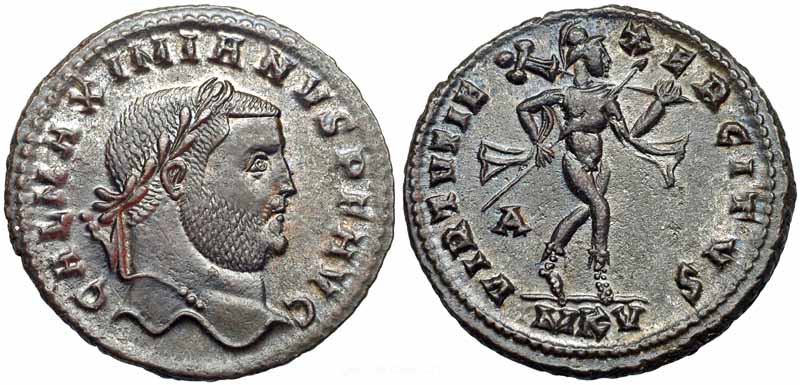 RIC 5b (VI, Aquileia), Depeyrot 2/4, C 238 Aureus Obv: MAXIMIANVSCAES - Laureate head right. Rev: No legend Exe: (eagle) - Wreath, VOT/X/CAESS within. c.293-294 (Aquileia). RIC 6b (VI, Serdica), Depeyrot 1/2 Aureus Obv: IMPMAXIMIANVPFAVG - Laureate head right. Rev: HERCVLIVICTORI Exe: backwards Σ/•SM•SD• - Hercules standing right, resting hand on club and holding apple with lion's skin. 305-306 (Serdica). RIC 7 (VI, Nicomedia), Calicó 4948, Depeyrot 3/4, C 200 Aureus Obv: MAXIMIANVSNOBCAES - Laureate head right. Rev: SOLIINVICTO Exe: SMN - Sol standing facing, raising hand and holding globe. 294 (Nicomedia). $7,911 5/10/05. RIC 9 (VI, Antioch) Aureus Obv: MAXIMIANVSNOBCAES - Laureate head right. Rev: IOVICONSCAES Exe: •SMA - Jupiter standing left, holding thunderbolt and scepter; eagle to lower left. c.293-295 (Antioch). RIC 10 (VI, Antioch), Depeyrot 9/5, C 118 Aureus Obv: MAXIMIANVSNOBCAES - Laureate head right. Rev: IOVICONSCAES Exe: SMA - Jupiter standing left, holding thunderbolt and scepter; eagle to lower left. c.293-295 (Antioch). RIC 62 (VI, Treveri), Calicó 4930, Depeyrot 7a/7 Aureus Obv: MAXIMIANVSNOBC - Laureate head right. Rev: MARTIPROPVGNATORI Exe: TR - Mars helmeted, cuirassed bust right. 302 (Treveri). $25,753 5/10/05. RIC 189 (VI, Siscia), Depeyrot 11/1 Aureus Obv: MAXIMIANVSPFAVG - Laureate head right. Rev: IOVICONSERVAT Exe: SIS - Jupiter standing left, holding thunderbolt and scepter; eagle to lower left. $3,650 4/1/01.