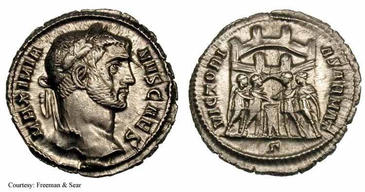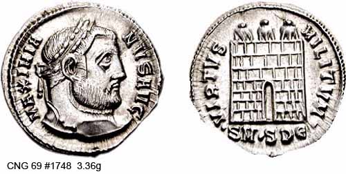 RIC 2b (VI, Serdica), C 223b Argenteus Obv: MAXIMIANVSNOBC - Laureate head right. Rev: VIRTVSMILITVM Exe: •SM•SDΔ• - City gate with three turrets. c.303-305 (Serdica). RIC 4 (VI, Heraclea), C 220d Argenteus Obv: MAXIMIANVSCAESAR - Laureate head right. Rev: VIRTVSMILITVM Exe: H - The Four Tetrarchs sacrificing over tripod, city gate in background. c.294 (Heraclea. $600 1/16/02. RIC 8 (VI, Heraclea), C 220e Argenteus Obv: MAXIMIANVSCAESAR - Laureate head right. Rev: VIRTVSMILITVM Exe: H - The Four Tetrarchs sacrificing over tripod, city gate in background. c.294 (Heraclea). $525 9/24/03. RIC 11b (VI, Serdica) Argenteus Obv: MAXIMIANVSAVG - Laureate head right. Rev: VIRTVSMILITVM Exe: •SM•SDE• - City gate with three turrets. 305-306 (Serdica). RIC 12b (VI, Thessalonica) Argenteus Obv: MAXIMIANVSNOBC - Laureate head right. Rev: VIRTVSMILITVM Exe: TS•Γ• - City gate with four turrets. c.302 (Thessalonica). RIC 17b (VI, Aquileia), C 250b Argenteus Obv: MAXIMIANVSCAESAR - Laureate head right. Rev: No legend Exe: AQ - Wreath, XCVI within. RIC 19b(var.) (VI, Ticinum) Argenteus Obv: MAXIMIANVSCAESA - Laureate head right. Rev: VIRTVSMILITVM - The Four Tetrarchs sacrificing over tripod, city gate in background. [RIC unlisted obv. legend]. c.295 (Ticinum). RIC 29b (VI, Rome), C 219a Argenteus Obv: MAXIMIANVSCAES - Laureate head right. Rev: VIRTVSMILITVM - The Four Tetrarchs sacrificing over tripod, city gate in background. RIC 33b (VI, Antioch), C 209 Argenteus Obv: MAXIMIANVSCAESAR - Laureate head right. Rev: VICTORIASARMATICAE Exe: /B/ANT - The Four Tetrarchs sacrificing over tripod, city gate in background. 294-295 (Antioch). RIC 38b (VI, Rome) Argenteus Obv: MAXIMIANVSCAES - Laureate head right. Rev: VICTORIASARMAT Exe: Γ - The Four Tetrarchs sacrificing over tripod, city gate in background. 295-297 (Rome). RIC 38b (VI, Ticinum) Argenteus Obv: MAXIMIANVSCAESAR - Laureate head right. Rev: VICTORIASARMAT - The Four Tetrarchs sacrificing over tripod, city gate in background. 294 (Ticinum). RIC 40b (VI, Antioch) Argenteus Obv: MAXIMIANVSCAESAR - Laureate head right. Rev: VIRTVSMILITVM Exe: ANT•H - City gate with three turrets. 297 (Antioch). RIC 42b (VI, Rome) Argenteus Obv: MAXIMIANVSCAES - Laureate head right. Rev: VIRTVSMILITVM Exe: - The Four Tetrarchs sacrificing over tripod, city gate in background. 295-297 (Rome). RIC 43b (VI, Antioch), C 225e Argenteus Obv: MAXIMIANVSCAESAR - Laureate head right. Rev: VIRTVSMILITVM Exe: ANT - City gate with three turrets. $235 2/4/04. RIC 635 (VI, Treveri) Argenteus Obv: MAXIMIANVSPFAVG - Laureate head right. Rev: VIRTVSMILITVM Exe: TR - City gate with four turrets. 305-306 (Treveri). Unlisted RIC, C 223 Argenteus Obv: MAXIMIANVSNOBC - Laureate head right. Rev: VIRTVSMILITVM Exe: TS•• - City gate with three turrets.
