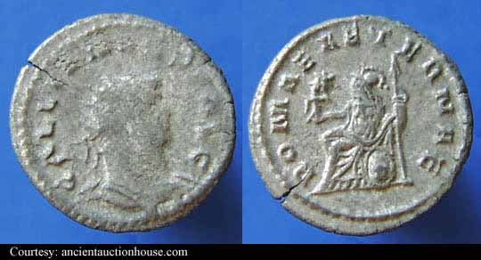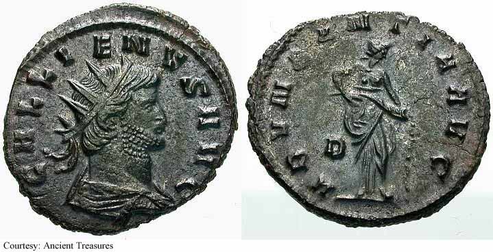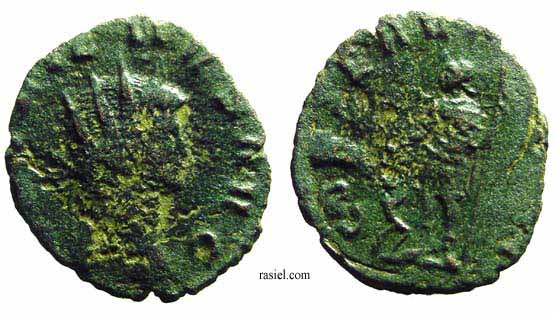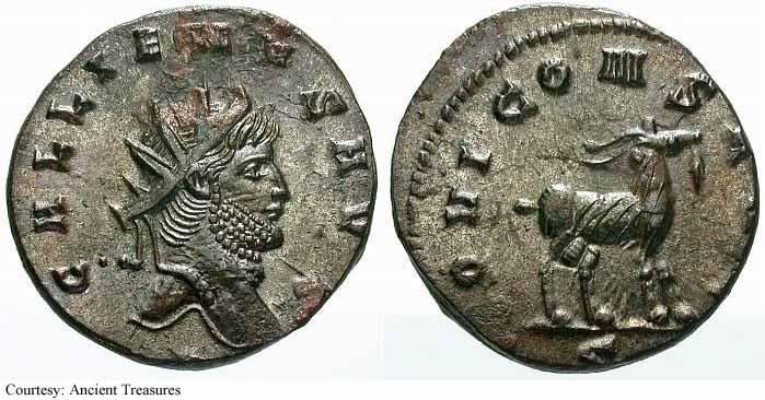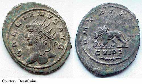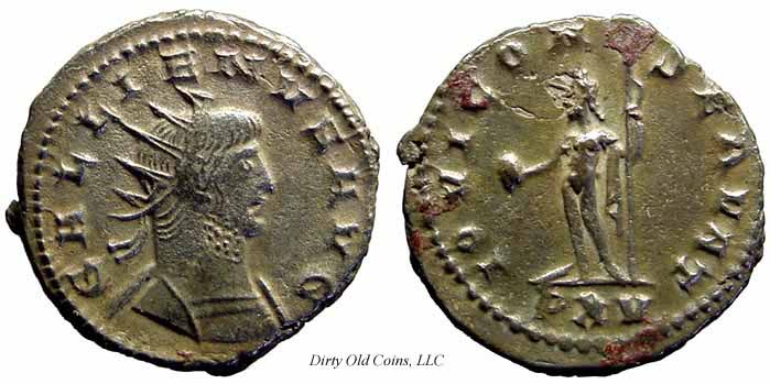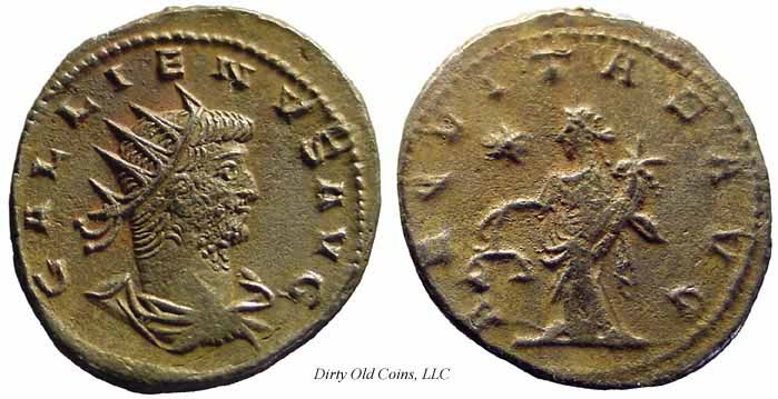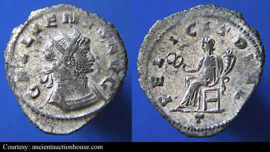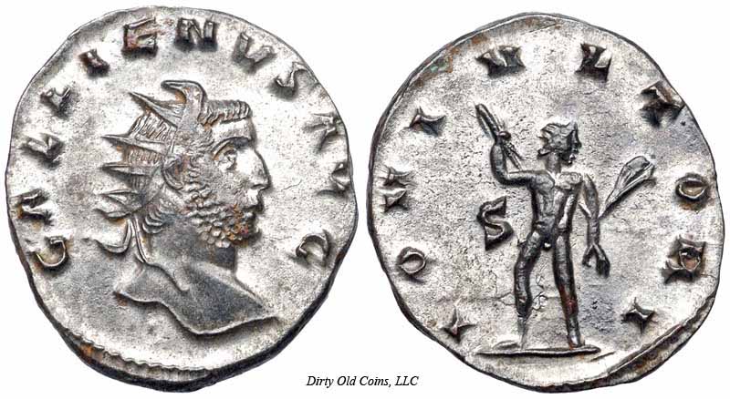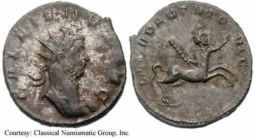 RIC 18, Göbl 872m, C 308 Antoninianus Obv: GALLIENVSPFAVG - Radiate, cuirassed bust left, holding spear over shoulder and shield. Rev: GERMANICVSMAXV - Trophy; seated captive on either side. 258-259 (Lugdunum). RIC 18f, Göbl 872n, C 308 Antoninianus Obv: GALLIENVSPFAVG - Radiate, cuirassed bust right. Rev: GERMANICVSMAXV - Trophy; seated captive on either side. 258-259 (Lugdunum). $20 4/24/05. RIC 21f, Göbl 870d, C 398 Antoninianus Obv: IMPGALLIENVSPAVG - Radiate, cuirassed bust right. Rev: IOVIVICTORI - Jupiter standing left on cippus reading IMP/CES, holding Victory and spear. 258 (Lugdunum). RIC 29c Antoninianus Obv: GALLIENVSPFAVG - Radiate, cuirassed bust right. Rev: RESTITGALLIAR - Gallienus standing left on right, holding hand of kneeling Gallia and scepter. 258 (Lugdunum). RIC 34v Antoninianus Obv: GALLIENVSAVGGERMV - Radiate bust left, holding spear over shoulder and shield. Rev: RESTITVTORGALLIAR - Gallienus standing left on right, holding hand of kneeling Gallia and scepter. 259 (Lugdunum). RIC 45, C 1048 Antoninianus Obv: GALLIENVSPFAVG - Radiate, cuirassed bust right. Rev: VICTGERMANICA - Victory advancing left, stepping on captive, holding wreath and palm. 258-259 (Lugdunum). $16 9/27/03. RIC 49f, C 1062 Antoninianus Obv: GALLIENVSPFAVG - Radiate, cuirassed bust right. Rev: VICTGERMANICA - Victory standing right on globe, holding wreath and palm; seated captive on either side. 258-259 (Lugdunum). $13 4/24/05. RIC 58, Göbl 882l, C 1309 Antoninianus Obv: GALLIENVSPFAVG - Radiate, cuirassed bust right. Rev: VIRTVSAVGG - Gallienus standing right, holding spear and standard. c.257-258 (Lugdunum). RIC 75 Antoninianus Obv: IMPCPLICGALLIENVSAVG - Radiate, draped and cuirassed bust right. Rev: FORTVNAREDVX - Mercury standing left, holding purse and caduceus. 253-254 (Rome). RIC 92, Göbl 512, C 1337 Antoninianus Obv: GALLIENVSAVG - Radiate, draped and cuirassed bust right. Rev: No legend - Wreath, VOTIS/DECENNA/LIB within. 263 (Rome). RIC 102f(var.) Antoninianus Obv: IMPGALLIENVSPFAVGGERM - Radiate, cuirassed bust right. Rev: VIRTVSAVGG - Mars advancing right, holding spear and trophy. [Bust type not noted by RIC for this issue]. 253-254 (Rome). RIC 131c, Göbl 13t, C 125 Antoninianus Obv: IMPCPLICGALLIENVSAVG - Radiate, draped and cuirassed bust right. Rev: CONCORDIAAVGG - Hands, in handshake. 253-254 (Rome). RIC 132f, C 131a Antoninianus Obv: IMPCPLICGALLIENVSAVG - Radiate, cuirassed bust right. Rev: CONCORDIAEXERCIT - Concordia standing left, holding patera and two cornucopiae. 253-254 (Rome). RIC 143f, C 363 Antoninianus Obv: IMPCPLICGALLIENVSAVG - Radiate, cuirassed bust right. Rev: IOVICONSERVA - Jupiter standing left, holding thunderbolt and scepter. 253-254 (Rome). RIC 148, C 571 Antoninianus Obv: IMPCPLICGALLIENVSPFAVG - Radiate, cuirassed bust right. Rev: LIBERALITASAVGG - Liberalitas standing left, holding coin counter and cornucopia. 255-256 (Rome). $99 1/7/03. RIC 181, Göbl 38t, C 1288 Antoninianus Obv: IMPCPLICGALLIENVSAVG - Radiate, draped and cuirassed bust right. Rev: VIRTVSAVGG - Virtus standing left, holding spear and leaning on shield. 254 (Rome). $60 2/4/04. RIC 291 Antoninianus Obv: IMPCPLICGALLIENVSAVG - Radiate, draped bust right. Rev: FELICITASSAECVLI - Diana standing right, holding torch. 253-254 (Viminacium). RIC 292 Antoninianus Obv: IMPCPLICGALLIENVSAVG - Radiate, draped and cuirassed bust right. Rev: FORTVNAREDVX - Mercury standing facing, head left, holding purse and caduceus. 256 (Viminacium). RIC 295 Antoninianus Obv: IMPCPLICGALLIENVSAVG - Radiate, draped and cuirassed bust right. Rev: PIETATIAVGG - Pietas standing left, leaning on column, holding scepter. 253-254 (Viminacium). RIC 296 Antoninianus Obv: IMPCPLICGALLIENVSAVG - Radiate, draped and cuirassed bust right. Rev: RESTITVTGENERHVMANI - Gallienus advancing right, raising hand and holding globe. 253-254 (Viminacium). RIC 315 Antoninianus Obv: GALLIENVSAVG - Radiate, cuirassed bust right holding spear over shoulder. Rev: LEGIADIVIPVIF - Capricornus advancing right. [Commemorating Legion I Adiatrix's participation in the defeat of Ingenuus]. 258 (Mediolanum). $500 5/21/03. RIC 324f, Göbl 990n Antoninianus Obv: GALLIENVSAVG - Radiate, cuirassed bust right. Rev: LEGIIADIVIPVIF - Pegasus poised right. [Commemorating Legion II Adiatrix's participation in the defeat of Ingenuus]. 258 (Mediolanum). RIC 324k Antoninianus Obv: GALLIENVSAVG - Radiate head left. Rev: LEGIIADIVIPVIF - Pegasus poised right. 258 (Mediolanum). RIC 329, Göbl 992r, C 472 Antoninianus Obv: GALLIENVSAVG - Radiate, cuirassed bust right. Rev: LEGIIITALVIPVIF - Wolf standing left, suckling Romulus and Remus. 258 (Mediolanum). RIC 336, C 483 Antoninianus Obv: GALLIENVSAVG - Radiate, cuirassed bust right. Rev: LEGIIPARTVIPVIF - Centaur advancing right, holding club. 260-262 (Mediolanum). RIC 353, Göbl 1009, C 522 Antoninianus Obv: GALLIENVSAVG - Radiate, cuirassed bust right. Rev: LEGVIIIAVGVIPVIF - Bull advancing right. 260-262 (Mediolanum). RIC 380, Göbl 920e Antoninianus Obv: IMPGALLIENVSAVG - Radiate, cuirassed bust right. Rev: DIANAFELIX - Diana advancing right, pulling arrow and holding bow; dog to lower right. 258-259 (Mediolanum). RIC 392, C 752 Antoninianus Obv: IMPGALLIENVSPAVG - Radiate, draped and cuirassed bust right. Rev: PAXAVGG - Pax standing left, holding branch and scepter. 258 (Mediolanum). RIC 395v Antoninianus Obv: IMPGALLIENVSPAVG - Radiate, cuirassed bust right. Rev: PROVIDAVGG - Providentia standing left, holding wand and cornucopia; star in right field. [In RIC this listing makes no mention of a star in field]. 253-260 (Mediolanum). RIC 405f, C 1148 Antoninianus Obv: IMPGALLIENVSAVG - Radiate, cuirassed bust right. Rev: VICTORIAAVGG - Victory advancing left, holding opened wreath; shield on either side. 253-260 (Mediolanum). $6 3/13/03. RIC 440, C 378 Antoninianus Obv: IMPCPLICGALLIENVSPFAVG - Radiate, draped and cuirassed bust right. Rev: IOVICONSERVATORI - Gallienus standing right on left, holding s