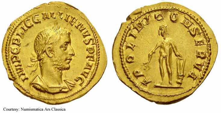 RIC 85v Aureus Obv: IMPCPLICGALLIENVSAVG - Laureate, draped and cuirassed bust right. Rev: LIBERTASAVGG - Libertas standing left, holding pileus and scepter. [RIC lists for laureate head right]. c.253-254 (Rome). Unlisted RIC, Calico 3469 Aureus Obv: IMPCPLICGALLIENVSPFAVG - Laureate, cuirassed bust right. Rev: APOLLINICONSERVA - Apollo standing left, holding branch and lyre on rock.
