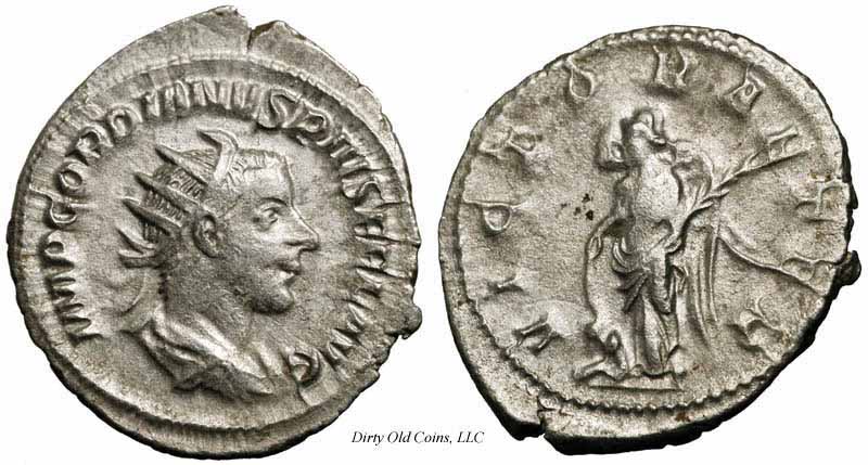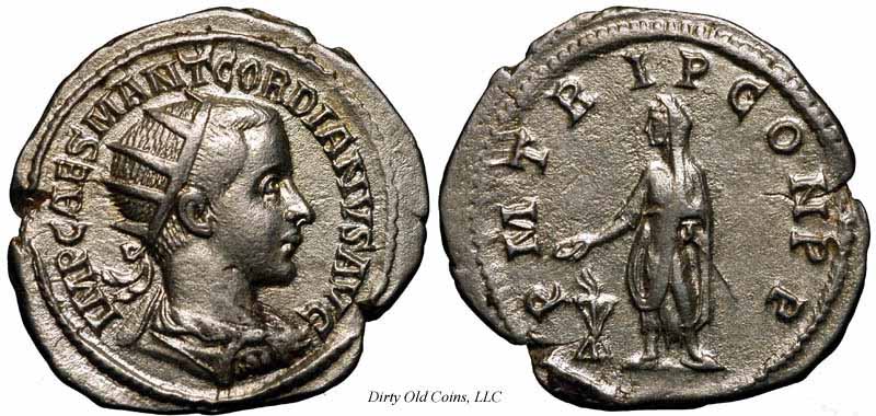 RIC 2, C 105 Antoninianus Obv: IMPCAESMANTGORDIANVSAVG - Radiate, draped and cuirassed bust right. Rev: IOVICONSERVATORI - Jupiter standing left, holding thunderbolt and scepter; Gordian III to lower left. $17 6/12/04. RIC 3, C 173 Antoninianus Obv: IMPCAESMANTGORDIANVSAVG - Radiate, draped and cuirassed bust right. Rev: PAXAVGVSTI - Pax standing left, holding branch and scepter. June - December 238 (Rome). RIC 4, C 302 Antoninianus Obv: IMPCAESMANTGORDIANVSAVG - Radiate, draped and cuirassed bust right. Rev: PROVIDENTIAAVG - Providentia standing left, holding globe and scepter. June - December 238 (Rome). $33 11/1/03. RIC 5, C 357 Antoninianus Obv: IMPCAESMANTGORDIANVSAVG - Radiate, draped and cuirassed bust right. Rev: VICTORIAAVG - Victory advancing left, holding wreath and palm. June-December 238 (Rome). RIC 6, C 381 Antoninianus Obv: IMPCAESMANTGORDIANVSAVG - Radiate, draped and cuirassed bust right. Rev: VIRTVSAVG - Virtus standing left, holding spear and resting on shield. June-December 238 (Rome). RIC 15, C 205 Antoninianus Obv: IMPCAESMANTGORDIANVSAVG - Radiate, draped and cuirassed bust right. Rev: PMTRPIICOSPP - Fides standing, facing, holding standard and scepter. $19 12/20/01. RIC 16, C 189 Antoninianus Obv: IMPCAESMANTGORDIANVSAVG - Radiate, draped and cuirassed bust right. Rev: PMTRPIICOSPP - Jupiter standing, facing, holding thunderbolt and scepter; Gordian III to lower left. 239 (Rome). RIC 17, C 203 Antoninianus Obv: IMPCAESMANTGORDIANVSAVG - Radiate, draped and cuirassed bust right. Rev: PMTRPIICOSPP - Pax standing left, holding branch and scepter. 239 (Rome). $15 12/31/02. RIC 18, C 196 Antoninianus Obv: IMPCAESMANTGORDIANVSAVG - Radiate, draped and cuirassed bust right. Rev: PMTRPIICOSPP - Providentia standing, facing, holding globe and scepter. 239 (Rome). RIC 19, C 199 Antoninianus Obv: IMPCAESMANTGORDIANVSAVG - Radiate, draped and cuirassed bust right. Rev: PMTRPIICOSPP - Victory advancing left, holding wreath and palm. 239 (Rome). RIC 20, C 194 Antoninianus Obv: IMPCAESMANTGORDIANVSAVG - Radiate, draped and cuirassed bust right. Rev: PMTRPIICOSPP - Virtus standing left, holding spear and resting hand on shield. RIC 27, C 190 Antoninianus Obv: IMPCAESMANTGORDIANVSAVG - Radiate, draped and cuirassed bust right. Rev: PMTRPIICOSPP - Jupiter seated left, holding globe and scepter; eagle to lower left. RIC 34, C 17 Antoninianus Obv: IMPCAESMANTGORDIANVSAVG - Radiate, draped and cuirassed bust right. Rev: AEQVITASAVG - Aequitas standing left, holding scales and cornucopia. April - September 239 (Rome). $28 10/3/02. RIC 35, C 50 Antoninianus Obv: IMPCAESMANTGORDIANVSAVG - Radiate, draped and cuirassed bust right. Rev: CONCORDIAAVG - Concordia seated left, holding patera and two cornucopiae. 239-240 (Rome). RIC 36, C 130 Antoninianus Obv: IMPCAESMANTGORDIANVSAVG - Radiate, draped and cuirassed bust right. Rev: LIBERALITASAVGII - Liberalitas standing left, holding coin counter and two cornucopiae. 239 (Rome). RIC 37, C 210 Antoninianus Obv: IMPCAESMANTGORDIANVSAVG - Radiate, draped and cuirassed bust right. Rev: PMTRPIICOSPP - Gordian III standing left, sacrificing over altar and holding scepter. $15 10/4/03. RIC 38, C 312 Antoninianus Obv: IMPCAESMANTGORDIANVSAVG - Radiate, draped and cuirassed bust right. Rev: ROMAEAETERNAE - Roma seated left, holding Victory and scepter. 239 (Rome). RIC 39, C 383 Antoninianus Obv: IMPCAESMANTGORDIANVSAVG - Radiate, draped and cuirassed bust right. Rev: VIRTVSAVG - Virtus standing, facing, holding branch and spear; shield to left. 239 (Rome). $13 6/12/04. RIC 51, C 22 Antoninianus Obv: IMPCAESGORDIANVSPIVSAVG - Radiate, draped and cuirassed bust right. Rev: AEQVITASAVG - Aequitas standing left, holding cornucopia and scales. March - May 240 (240). $44 4/4/03. RIC 52, C 53 Antoninianus Obv: IMPCAESGORDIANVSPIVSAVG - Radiate, draped and cuirassed bust right. Rev: CONCORDIAAVG - Concordia seated left, holding patera and two cornucopiae. RIC 53, C 133 Antoninianus Obv: IMPCAESGORDIANVSPIVSAVG - Radiate, draped and cuirassed bust right. Rev: LIBERALITASAVGII - Liberalitas standing left, holding coin counter and two cornucopiae. March - May 240 (Rome). $33 1/8/02. RIC 54, C 212 Antoninianus Obv: IMPCAESGORDIANVSPIVSAVG - Radiate, draped and cuirassed bust right. Rev: PMTRPIICOSPP - Gordian standing left, sacrificing over altar and holding scepter. March - May 240 (Rome). RIC 55, C 313 Antoninianus Obv: IMPCAESGORDIANVSPIVSAVG - Radiate, draped and cuirassed bust right. Rev: ROMAEAETERNAE - Roma seated left, holding Victory and scepter. March - May 240 (Rome). $100 4/17/03. RIC 56, C 386 Antoninianus Obv: IMPCAESGORDIANVSPIVSAVG - Radiate, draped and cuirassed bust right. Rev: VIRTVSAVG - Virtus standing left, holding branch and spear; shield to lower left. RIC 63, C 25 Antoninianus Obv: IMPGORDIANVSPIVSFELAVG - Radiate, draped and cuirassed bust right. Rev: AEQVITASAVG - Aequitas standing left, holding scales and cornucopia. $16 2/18/02. RIC 64, C 52 Antoninianus Obv: IMPGORDIANVSPIVSFELAVG - Radiate, draped and cuirassed bust right. Rev: CONCORDIAAVG - Concordia seated left, holding patera and two cornucopiae. 240-241 (Rome). RIC 65, C 62 Antoninianus Obv: IMPGORDIANVSPIVSFELAVG - Radiate, draped and cuirassed bust right. Rev: CONCORDIAMILIT - Concordia seated left, holding patera and two cornucopiae. $13 11/13/01. RIC 67, C 142 Antoninianus Obv: IMPGORDIANVSPIVSFELAVG - Radiate, draped and cuirassed bust right. Rev: LIBERALITASAVGIII - Liberalitas standing left, holding coin counter and cornucopia. RIC 68, C 216 Antoninianus Obv: Obv: IMPGORDIANVSPIVSFELAVG - Radiate, draped and cuirassed bust right. Rev: PMTRPIICOSPP - Gordian III standing left, sacrificing over altar and holding scepter. 240 (Rome). $15 11/16/01. RIC 69, C 226 Antoninianus Obv: Obv: IMPGORDIANVSPIVSFELAVG - Radiate, draped and cuirassed bust right. Rev: PMTRPIIICOSPP - Gordian III standing left, sacrificing over altar and holding scepter. March-May 240 (Rome). RIC 70, C 31