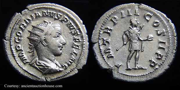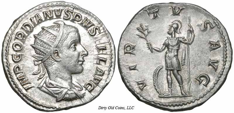 Unlisted RIC, Gnecchi 35 Obv: IMPGORDIANVSPIVSFELIXAVG - Laureate, cuirassed bust right with spear over left shoulder. Rev: PONTIFEXMAXTRPIIII Exe: COSIIPP - Gordian III riding oncoming quadriga. $8,020 11/20/00. Unlisted RIC, Gnecchi 58 Obv: IMPGORDIANVSPIVSFELIXAVG - Laureate, cuirassed bust left, holding spear over shoulder and shield. Rev: VIRTVSAVGVSTI - Gordian III standing left on right, receiving globe from Sol to left and being crowned by Virtus to right; two standards in center background, two captives seated below and soldier on left, holding spear and vexillum. 244 (Rome). Unlisted Obv: IMPGORDIANVSPIVSFELIXAVG - Laureate, draped and cuirassed bust left, holding Victory and scepter. Rev: MVNIFICENTIAGORDIANIAVG - Bull fighting elephant within the Colosseum, seen from above; Colossus of Nero and Meta Sudans on either side. 243 (Rome).