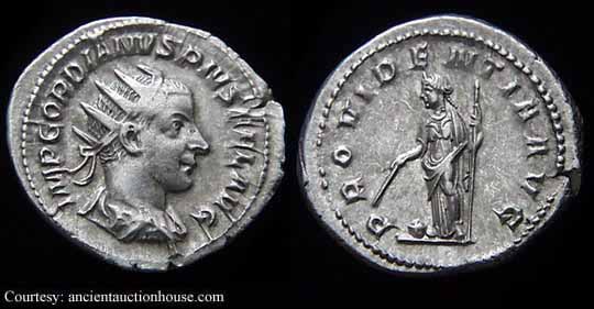 RIC 81, C 234 Denarius Obv: IMPGORDIANVSPIVSFELAVG - Laureate, draped and cuirassed bust right. Rev: PMTRPIIICOSPP - Gordian III riding horse left, raising hand and holding scepter. 240 (Rome). $65 12/21/02. RIC 111, C 39 Denarius Obv: IMPGORDIANVSPIVSFELAVG - Laureate, draped and cuirassed bust right. Rev: AETERNITATIAVG - Sol standing left, raising and holding globe. $31 12/4/02. RIC 112, C 113 Denarius Obv: IMPGORDIANVSPIVSFELAVG - Laureate, draped and cuirassed bust right. Rev: IOVISSTATOR - Jupiter standing, facing, holding scepter and thunderbolt. RIC 113, C 120 Denarius Obv: IMPGORDIANVSPIVSFELAVG - Laureate, draped and cuirassed bust right. Rev: LAETITIAAVGN - Laetitia standing left, holding wreath and anchor. RIC 114, C 238 Denarius Obv: IMPGORDIANVSPIVSFELAVG - Laureate, draped and cuirassed bust right. Rev: PMTRPIIICOSIIPP - Apollo seated left, holding branch. 240 (Rome). $68 5/27/04. RIC 115, C 243 Denarius Obv: IMPGORDIANVSPIVSFELAVG - Laureate, draped and cuirassed bust right. Rev: PMTRPIIICOSIIPP - Gordian III standing right, holding spear and globe. RIC 116, C 403 Denarius Obv: IMPGORDIANVSPIVSFELAVG - Laureate, draped and cuirassed bust right. Rev: VIRTVTIAVGVSTI - Hercules standing right, resting hand on hip and leaning on club with lion skin on rock. 240 (Rome). $72 4/6/03. RIC 127, C 69 Denarius Obv: IMPGORDIANVSPIVSFELAVG - Laureate, draped and cuirassed bust right. Rev: DIANALVCIFERA - Diana standing right, holding torch with both hands. 240 (Rome). RIC 129 Denarius Obv: IMPGORDIANVSPIVSFELAVG - Laureate, draped and cuirassed bust right. Rev: PIETASAVGVSTI - Pietas standing, facing, raising hands. RIC 129a, C 325 Denarius Obv: IMPGORDIANVSPIVSFELAVG - Laureate, draped and cuirassed bust right. Rev: SALVSAVGVSTI - Salus standing right, holding and feeding snake. 240 (Rome). $22 9/20/03. RIC 130, C 340 Denarius Obv: IMPGORDIANVSPIVSFELAVG - Laureate, draped and cuirassed bust right. Rev: SECVRITASPVBLICA - Securitas seated left, holding scepter and resting head on hand. RIC 131 Denarius Obv: IMPGORDIANVSPIVSFELAVG - Laureate, draped and cuirassed bust right. Rev: VENVSVICTRIX - Venus standing left, holding helmet and cradling scepter; shield to right. 240 (Rome). $53 9/11/04.