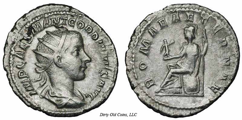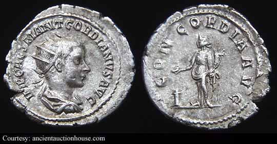 RIC 75, C 63 Quinarius Obv: IMPGORDIANVSPIVSFELAVG - Laureate, draped and cuirassed bust right. Rev: CONCORDIAMILIT - Concordia seated left, holding patera and two cornucopiae. 240 (Rome). $700 5/21/03.