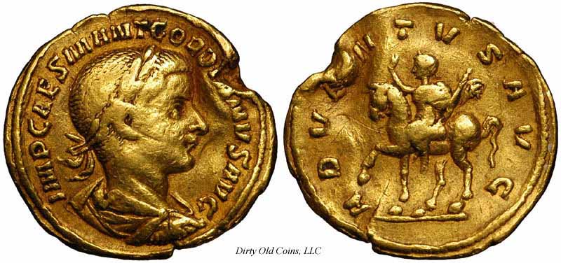RIC 97, C 37 Aureus Obv: IMPGORDIANVSPIVSFELAVG - Laureate, draped and cuirassed bust right. Rev: AETERNITATIAVG - Sol standing, facing, raising hand and holding globe. 241-243 (Rome). $4,500 2/1/05. RIC 108, C 401 Aureus Obv: IMPGORDIANVSPIVSFELAVG - Laureate, draped and cuirassed bust right. Rev: VIRTVTIAVGVSTI - Hercules standing right, resting hand on hip and leaning on club. 241 (Rome). $3,175 2/18/02. RIC 121, C 39 Aureus Obv: IMPGORDIANVSPIVSFELAVG - Laureate, draped and cuirassed bust right. Rev: DIANALVCIFERA - Diana standing right, holding torch with both hands. 241 (Rome). RIC 247v Aureus Obv: IMPCAESMANTGORDIANVSAVG - Laureate, draped and cuirassed bust right. Rev: ADVENTVSAVG - Gordian III riding horse left, raising hand and holding scepter. [RIC lists for Gordian III riding horse right]. Calicó 3230a Aureus Obv: IMPCAESMANTGORDIANVSAVG - Laureate, draped and cuirassed bust right. Rev: ROMAEAETERNAE - Roma seated left on shield, holding Victory and scepter. 239 (Rome). $4,000 1/12/05.