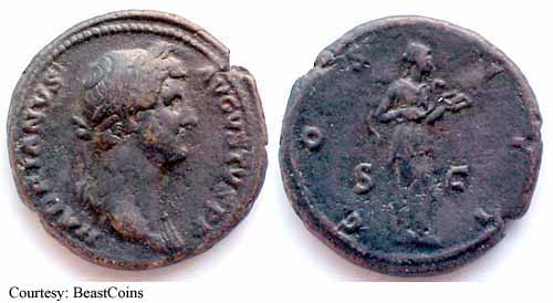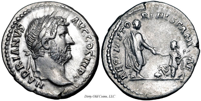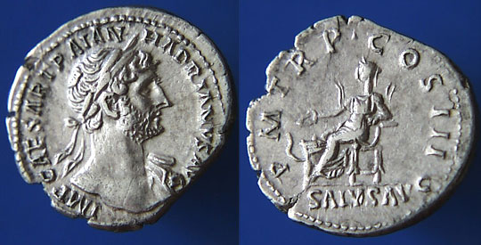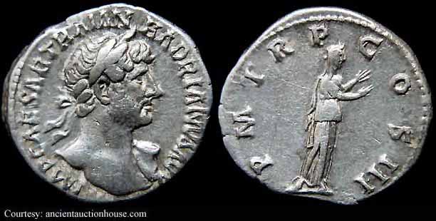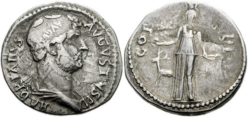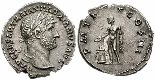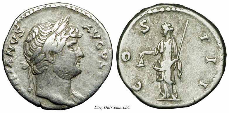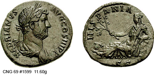RIC 616b, C 1142 As Obv: IMPCAESARTRAIANHADRIANVSAVG - Laureate bust right with drapery on left shoulder. Rev: PMTRPCOSIII - Pax standing left, holding branch and cornucopia. 120-121 (Rome). RIC 616c, C 1142 As Obv: IMPCAESARTRAIANHADRIANVSAVG - Laureate, draped and cuirassed bust right. Rev: PMTRPCOSIII - Pax standing left, holding branch and cornucopia. RIC 616v As Obv: IMPCAESARTRAIANHADRIANVSAVG - Laureate, cuirassed bust right. Rev: PMTRPCOSIII - Pax standing left, holding branch and cornucopia. RIC 665 As Obv: HADRIANVSAVGVSTVS - Laureate head right. Rev: COSIII - Roma advancing right, holding spear and cornucopia; S C across fields. RIC 666, C 346 As Obv: HADRIANVSAVGVSTVS - Laureate head right. Rev: COSIII Exe: SC - Roma seated left, holding Victory and spear. $11 3/13/05. RIC 669d As Obv: HADRIANVSAVGVSTVS - Laureate head right. Rev: COSIII - Salus standing right holding snake in arms and feeding out of patera to right; S C across fields. 125-128 (Rome). RIC 678, BMC 1349, S 3692, C 1357 As Obv: HADRIANVSAVGVSTVS - Laureate head right. Rev: SALVSAVGVSTI Exe: COSIII - Salus standing left, feeding snake on altar. c.124-128 (Rome). $207 5/21/04. RIC 714, C 510 As Obv: HADRIANVSAVGVSTVS - Laureate head right. Rev: COSIIIPPCLEMENTIAAVG - Clementia standing left, holding patera and scepter; SC across fields. RIC 716, C 482 As Obv: HADRIANVSAVGVSTVS - Laureate head right. Rev: COSIIIPP - Roma standing right, stepping on helmet, holding spear and cornucopia. 129 (Rome). $16 12/15/02. RIC 719, C 667 As Obv: HADRIANVSAVGVSTVS - Laureate head right. Rev: FELICITATIAVG Exe: COSIIIPP - Galley sailing left. c.132-135 (Rome). RIC 725f As Obv: HADRIANVSAVGVSTVS - Laureate, draped bust right. Rev: INDVLGENTIAAVGCOSIIIPP - Indulgentia seated left, raising hand and holding scepter. 132-134 (Rome). $17 9/27/03. RIC 795e As Obv: HADRIANVSAVGCOSIIIPP - Laureate head right. Rev: AEQVITASAVG - Aequitas standing left, holding scales and scepter. $14 10/4/03. RIC 796a, C 166 As Obv: HADRIANVSAVGCOSIIIPP - Bare-headed, draped bust right left shoulder. Rev: ANNONAAVG - Annona standing left, holding corn ears over modius and rudder. 134-138 (Rome). RIC 796d, C 168 As Obv: HADRIANVSAVGCOSIIIPP - Laureate head right. Rev: ANNONAAVG - Annona standing left, holding grain ears over modius and rudder on galley to right. 134-138 (Rome). RIC 796v As Obv: HADRIANVSAVGCOSIIIPP - Laureate, draped bust right. Rev: ANNONAAVG - Annona standing left, holding grain ears over modius and rudder on galley to right. [RIC unlisted bust type for this issue]. 134-138 (Rome). $11 3/13/05. RIC 812f, C 773 As Obv: HADRIANVSAVGCOSIIIPP - Laureate, draped bust right. Rev: FORTVNAAVG - Fortuna standing left, holding patera and cornucopia. 134-138 (Rome). RIC 827, C 1359 As Obv: HADRIANVSAVGCOSIIIPP - Laureate, draped bust right. Rev: No legend - Minerva advancing right, aiming javelin and holding shield. c.134-138 (Rome). RIC 831, C 1394 As Obv: HADRIANVSAVGCOSIIIPP - Laureate head right. Rev: No legend - Wreath, large SC within. c.134-138 (Rome). $9 3/13/05. RIC 835f, C 144 As Obv: HADRIANVSAVGCOSIIIPP - Laureate, draped bust right. Rev: TELLVSSTABIL Exe: SC - Tellus laying left, resting hand on globe and holding branch. RIC 840f, C 144 As Obv: HADRIANVSAVGCOSIIIPP - Laureate, draped bust right. Rev: AFRICA Exe: SC - Africa reclining left, wearing elephant headdress, holding cornucopia and a scorpion; at her feet, a basket of fruit. RIC 848f, C 202 As Obv: HADRIANVSAVGCOSIIIPP - Laureate, draped bust right. Rev: CAPPADOCIA - Cappadocia standing left, holding miniature of Mt. Argaeus and standard. 134-138 (Rome). RIC 852v, BMC 1754, C 832 As Obv: HADRIANVSAVGCOSIIIPP - Laureate, draped bust right. Rev: HISPANIA Exe: SC - Hispania lying left, holding branch; rabbit to left. 134-138 (Rome). RIC 957g, C 1277 As Obv: HADRIANVSAVGCOSIIIPP - Bare bust left. Rev: RESTITVTORITALIAE - Italia on right holding cornucopia takes the hand of Hadrian on left. 136 (Rome). RIC 975c As Obv: HADRIANVSAVGVSTVSPP - Laureate head right, draped left shoulder. Rev: COSIII - Salus standing right feeding snake in her arms. 128-132 (Rome). RIC 987, BMC 1847 As Obv: HADRIANVSAVGCOSIIISPP - Laureate, draped bust right. Rev: AELIVSCAESAR - Bare-headed, draped bust right. 136-138 (Rome). Unlisted As Obv: IMPCAESARTRAIANHADRIANVSAVG - Laureate bust right. Rev: PMTRPCOSIII - Pietas standing left, raising hands over altar; PIE AVG and S C across fields. 120-121 (Rome). $48 9/20/03.