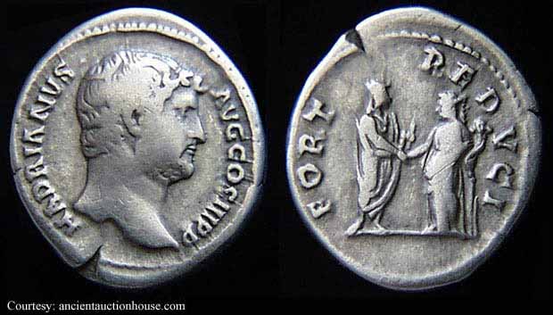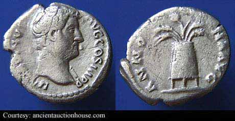 RIC 4c, C 250 Denarius Obv: IMPCAESTRAIANHADRIANOPTAVGGERDAC - Laureate head right. Rev: PARTHICDIVITRAIANAVGFPMTRPCOSPP Exe: CONCORD - Concordia seated left, holding patera with cornucopia under chair and Spes as arm of chair upon which rests the elbow of Concordia. $42 11/29/03. RIC 6, C 875 Denarius Obv: IMPCAESTRAIANHADRIANOPTAVGGERDAC - Laureate, draped and cuirassed bust right. Rev: PARTHICDIVITRAIANAVGFPMTRPCOSPP Exe: IVSTITIA - Justitia seated left, holding patera and scepter. 117 (Rome). RIC 9a, BMC 17, C 248 Denarius Obv: IMPCAESARTRAIANHADRIANOAVGDIVITRA - Laureate head right. Rev: PARTHFDIVINERNEPPMTRPCOS Exe: CONCORD - Concordia seated left, holding patera and resting arm on Spes; cornucopia under chair. 117 (Rome). $173 5/21/04. RIC 9c, BMC 17, C 248 Denarius Obv: IMPCAESARTRAIANHADRIANOAVGDIVITRA - Laureate, draped and cuirassed bust right. Rev: PARTHFDIVINERNEPPMTRPCOS Exe: CONCORD - Concordia seated left, holding patera and resting arm on Spes; cornucopia under chair. 117 (Rome). RIC 10c, BMC 20, C 749a Denarius Obv: IMPCAESTRAIANHADRIANOAVGDIVITRA - Laureate, draped and cuirassed bust right. Rev: PARTHFDIVINERNEPPMTRPCOS Exe: FORTRED - Fortuna seated left, holding rudder and cornucopia. 117 (Rome). RIC 12c(var.) Denarius Obv: IMPCAESARTRAIANHADRIANOAVGDIVITRA - Laureate, draped and cuirassed bust right. Rev: PARTHFDIVINERNEPPMTRPCOS Exe: PAX - Pax standing left, holding branch and cornucopia. [RIC lists legend as IMP CAESAR TRAIAN HADRIANO AVG DIVI TRA]. 117 (Rome). RIC 13, C 1023 Denarius Obv: IMPCAESTRAIANHADRIANOAVGDIVITRA - Laureate head right. Rev: PARTHFDIVINERNEPPMTRPCOS - Pietas standing left, raising hand; PIE TAS across fields. 117 (Rome). RIC 17c, C 251 Denarius Obv: IMPCAESARTRAIANHADRIANVSAVG - Laureate bust right. Rev: PMTRPCOSDESII Exe: CONCORD - Concordia seated left, holding patera; beneath her chair is a cornucopia, beneath her elbow, a statue of Spes. RIC 21 Denarius Obv: IMPCAESARTRAIANHADRIANVSAVG - Laureate head right, draped left shoulder. Rev: PMTRPCOSDESII Exe: PAX - Pax standing left, holding branch and cornucopia. 117 (Rome). RIC 19a, C 876 Denarius Obv: IMPCAESARTRAIANHADRIANVSAVG - Laureate head right, draped left shoulder Rev: PMTRPCOSDESII Exe: IVSTITIA - Justitia seated left, holding scepter and patera. $16 11/10/01. RIC 39a, C 252 Denarius Obv: IMPCAESARTRAIANHADRIANVSAVG - Laureate head right, draped left shoulder. Rev: PMTRPCOSII Exe: CONCORD - Concordia seated left, holding patera left; arm of chair is a statue of Spes. 118 (Rome). $24 5/15/03. RIC 41a, S 3493, C 745 Denarius Obv: IMPCAESARTRAIANHADRIANVSAVG - Laureate head right, draped left shoulder. Rev: PMTRPCOSII Exe: FORTRED - Fortuna seated left, holding rudder and cornucopia. 118 (Rome). $41 1/7/03. RIC 42a, C 877 Denarius Obv: IMPCAESARTRAIANHADRIANVSAVG - Laureate bust right. Rev: PMTRPCOSII Exe: IVSTITIA - Justice seated left, holding patera and scepter. RIC 44, BMC 78, S 3511, C 1015 Denarius Obv: IMPCAESARTRAIANHADRIANVSAVG - Laureate head right. Rev: PMTRPCOSII Exe: PAX - Pax standing left, holding olive branch and cornucopia. 118 (Rome). RIC 44, S 3511, C 1015b Denarius Obv: IMPCAESARTRAIANHADRIANVSAVG - Laureate, cuirassed bust right. Rev: PMTRPCOSII Exe: PAX - Pax standing left, holding olive branch and cornucopia. 118 (Rome). RIC 45a, C 1027 Denarius Obv: IMPCAESARTRAIANHADRIANVSAVG - Laureate head right, draped left shoulder. Rev: PMTRPCOSII - Pietas, veiled and standing right, raising hands as if clapping; PIE TAS across fields. 118 (Rome). $62 12/10/02. RIC 46, C 1330 Denarius Obv: IMPCAESARTRAIANHADRIANVSAVG - Laureate head right, draped left shoulder. Rev: PMTRPCOSII Exe: SALVSAVG - Salus seated left, feeding snake on altar. RIC 47, C 1475 Denarius Obv: IMPCAESARTRAIANHADRIANVSAVG - Laureate head right, draped left shoulder. Rev: PMTRPCOSII - VOT PVB across fields; Pietas, veiled and standing right with outstretched arms. RIC 51, C 1352 Denarius Obv: IMPCAESARTRAIANHADRIANVSAVG - Laureate head right, draped left shoulder. Rev: PMTRPCOSDESIII Exe: SALVSAVG - Salus seated left, holding patera and feeding snaked rising from altar left. 118 (Rome). $22 12/27/02. RIC 52, C 1476 Denarius Obv: IMPCAESARTRAIANHADRIANVSAVG - Laureate head right, draped left shoulder. Rev: PMTRPCOSIII - Pietas, veiled and standing right, raising hands as if clapping. RIC 63d, C 1059 Denarius Obv: IMPCAESARTRAIANHADRIANVSAVG - Laureate, draped and cuirassed bust right. Rev: PMTRPCOSIII - Jupiter standing front, holding thunderbolt at side and scepter. RIC 67b, S 3516, C 1073 Denarius Obv: IMPCAESARTRAIANHADRIANVSAVG - Laureate head right, draped left shoulder. Rev: PMTRPCOSIII - Mars advancing right, holding spear and trophy. 121 (Rome). $22 1/18/04. RIC 69c, S 3517, C 1063 Denarius Obv: IMPCAESARTRAIANHADRIANVSAVG - Laureate, draped and cuirassed bust right. Rev: PMTRPCOSIII - Minerva advancing right, aiming javelin and holding shield. 122 (Rome). RIC 75v, BMC 127, C 1111 Denarius Obv: IMPCAESARTRAIANHADRIANVSAVG - Laureate, draped bust right. Rev: PMTRPCOSIII - Oceanus laying left on dolphin, holding upturned anchor. c.119-125 (Rome). RIC 76, BMC 149, C 1107 Denarius Obv: IMPCAESARTRAIANHADRIANVSAVG - Laureate, draped, and cuirassed bust right. Rev: PMTRPCOSIII - Roma standing left, holding Victory and reversed spear. c.119-125 (Rome). RIC 77a, S 3591 Denarius Obv: IMPCAESARTRAIANHADRIANVSAVG - Laureate head right. Rev: PMTRPCOSIII - Roma seated on cuirass left, holding Victory and spear, shield behind. 123 (Rome). RIC 77b, S 3591, C 1103 Denarius Obv: IMPCAESARTRAIANHADRIANVSAVG - Laureate head right, drapery on left shoulder. Rev: PMTRPCOSIII - Roma seated on cuirass left, holding Victory and spear, shield behind. 123 (Rome). RIC 77c, C 1104 Denarius Obv: IMPCAESARTRAIANHADRIANVSAVG - Laureate, draped and cuirassed bust right. Rev: PMTRPCOSIII - Roma seated on cuirass left, holding Victory and spear, shield behind. 119-122 (Rome). $37 1/2/02. RIC 78, BMC 146, C 1099 Denarius Obv: IMPCA