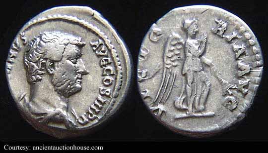 RIC 108 Quinarius Obv: IMPCAESARTRAIANHADRIANVSAVG - Laureate, draped and cuirassed bust right. Rev: PMTRPCOSIII - Victory seated left on chair, holding wreath and palm. 121-122 (Rome).
