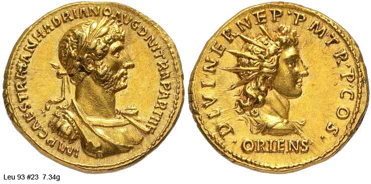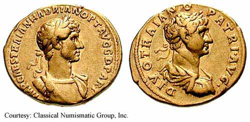 RIC 24b, BMC 45 Aureus Obv: IMPCAESTRAIANHADRIANOOPTAVGGDPART - Bare head right. Rev: DIVOTRAIANOPATRIAVG - Laureate, draped and cuirassed bust of Trajan right. $6,000 9/25/02. RIC 46, Calicó 1368, C 1349 Aureus Obv: IMPCAESARTRAIANHADRIANVSAVG - Laureate, draped and cuirassed bust right. Rev: PMTRPCOSII Exe: SALVSAVG - Salus seated left, feeding snake coiled round altar. c.118 (Rome). RIC 51v Aureus Obv: IMPCAESARTRAIANHADRIANVSAVG - Laureate, draped and cuirassed right. Rev: PMTRPCOSDESIII Exe: SALVSAVG - Salus seated left, feeding snake on altar. 118 (Rome). $8,000 1/10/05. RIC 56, C 1083 Aureus Obv: IMPCAESARTRAIANHADRIANVSAVG - Laureate head right. Rev: PMTRPCOSIII - Hercules standing facing in dystile temple, holding club and an apple in his outstretched left; below, river-god reclining left. c.119-122 (Rome). RIC 63, Calicó 1301b, Cohen 1057 Aureus Obv: IMPCAESARTRAIANHADRIANVSAVG - Laureate, draped and cuirassed bust right. Rev: PMTRPCOSIII - Jupiter standing right, holding thunderbolt and scepter. c.119-125 (Rome). $1,750 9/22/04. RIC 72, C 1079 Aureus Obv: IMPCAESARTRAIANHADRIANVSAVG - Laureate head right. Rev: PMTRPCOSIII - Neptune standing left, holding acrostolium and trident. $1,500 5/22/02. RIC 77v, BMC 133 Aureus Obv: IMPCAESARTRAIANHADRIANVSAVG - Laureate, draped and cuirassed bust right. Rev: PMTRPCOSIII - Roma seated left, holding Victory and spear; snake on altar to right. [RIC omits the snake on altar]. 119-122 (Rome). RIC II 127, BMCRE 281, Calicó 1284, Cohen 902 Aureus Obv: IMPCAESARTRAIANHADRIANVSAVG - Laureate, draped and cuirassed bust right. Rev: PMTRPCOSIII Exe: LIBPVB - Libertas seated left, holding branch and scepter. 119-125 (Rome). $7,500 5/10/05. RIC 144, BMC 333, C 162 Aureus Obv: IMPCAESHADRIANVSAVGCOSIII - Laureate, draped and cuirassed bust right. Rev: ANNDCCCLXXIIIINATVRBPCIRCON - Genius of the Circus reclining left, head right, holding wheel and holding meta set on base at the end of the circus spina. April 121 (Rome). $39,000 1/12/04. RIC 156, Calicó 1320, Cohen 1083 Aureus Obv: IMPCAESARTRAIANHADRIANVSAVG - Laureate head right. Rev: PMTRPCOSIII - Temple with two columns; Hercules standing facing within, resting hand on club and holding apples with river god below lying left, raising hand. 119-125 (Rome). $6,250 1/12/04. RIC 168, BMC 378 Aureus Obv: HADRIANVSAVGVSTVS - Laureate bust right. Rev: COSIII - Sol in prancing quadriga left. c.125-128 (Rome). RIC 188e, BMC 439 Aureus Obv: HADRIANVSAVGVSTVS - Laureate, draped and cuirassed bust right. Rev: COSIII - Hadrian on prancing horse left, holding scepter in left hand and raising right. c.125-128 (Rome). RIC 193, BMC 448, C 422 Aureus Obv: HADRIANVSAVGVSTVS - Laureate head right, drapery on left shoulder. Rev: COS Exe: III - She-wolf standing left suckling twins. 124-128 (Rome). $5,000 1/13/03. RIC 204b, BMC 530, C 485 Aureus Obv: HADRIANVSAVGVSTVS - Bare head right. Rev: COSIIIPP - Hadrian standing left, raising hand and holding spear; three standards behind. c.134-138 (Rome). $8,000 1/12/04. RIC 241, C 715 Aureus Obv: HADRIANVSAVGCOSIIIPP - Bare-headed, draped bust right. Rev: FIDESPVBLICA - Fides standing right, holding grain ears and fruit basket. c.134-138 (Rome). RIC 252a, C 878 Aureus Obv: HADRIANVSAVGCOSIIIPP - Bare head right. Rev: IVSTITIAAVG - Justitia seated left, holding patera and scepter. RIC 296, Calicó 1188, C 105 Aureus Obv: HADRIANVSAVGCOSIIIPP - Bare head right. Rev: AEGYPTOS - Egypt laying left, holding sistrum and leaning on modius; Ibis on cippus to left. 134-138 (Rome). $66,959 5/10/05. RIC 298, BMC 808 Aureus Obv: HADRIANVSAVGCOSIIIPP - Bare headed, draped bust right. Rev: AFRICA - Africa laying left, resting hand on lion's head. 134-138 (Rome). RIC 305h, C 828 Aureus Obv: HADRIANVSAVGCOSIIIPP - Bare-headed, draped bust left. Rev: HISPANIA - Hispania reclining left, holding branch, rabbit at her feet. c.132 (Rome). RIC 348, BMC 504, C 410 Aureus Obv: HADRIANVSAVGVSTVSPP - Laureate, draped and cuirassed bust right. Rev: No legend Exe: COSIII - Hadrian on horse prancing right, right hand raised. 128-132 (Rome). $9,500 1/12/04. RIC 348e, BMC 503, Calicó 1221a, C 410 Aureus Obv: HADRIANVSAVGVSTVSPP - Laureate, draped and cuirassed bust right. Rev: COSIII - Hadrian on horse prancing right, right hand raised. 128-132 (Rome). $3,000 9/22/04.