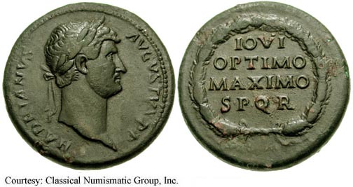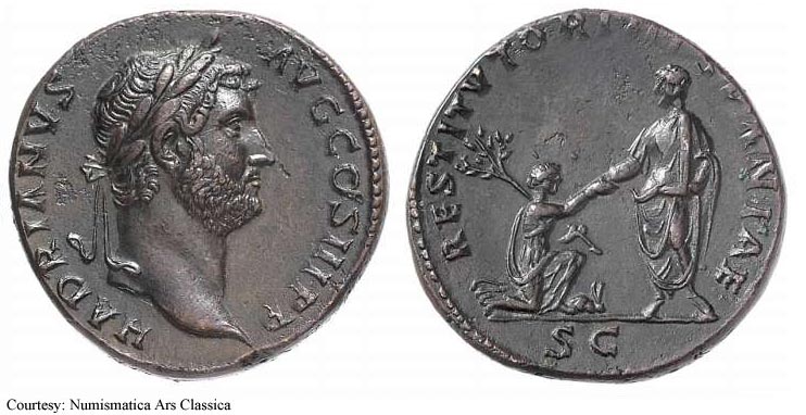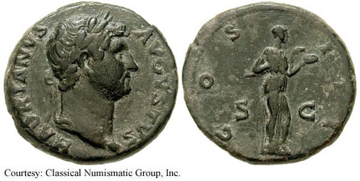 RIC 536, C 740 Sestertius Obv: IMPCAESDIVITRAIANHADRIANOPTAVGGER - Laureate bust right. Rev: DACPARTHICOPMTRPCOSPP Exe: FORTRED/SC - Fortuna seated left, holding rudder and cornucopia. 117 (Rome). RIC 541a(var.), BMC 1111 Sestertius Obv: IMPCAESDIVITRAPARTHFDIVINERNEPTRAIANOHADRIANOAVG - Laureate bust right, drapery on left shoulder. Rev: PONTMAXTRPOTCOS Exe: FORTRED/SC - Fortuna seated left, holding rudder and cornucopia. [RIC lists for cuirassed bust]. 117 (Rome). RIC 542 Sestertius Obv: IMPCAESDIVITRAPARTHFDIVINERNEPTRAIANOHADRIANOAVG - Laureate bust right. Rev: PONTMAXTRPOTCOSDESII Exe: CONCORD - Concordia seated left, holding patera; beneath her chair is a cornucopia, beneath her elbow, a statue of Spes. RIC 548, C 178 Sestertius Obv: IMPCAESARTRAIANVSHADRIANVSAVG - Laureate bust right. Rev: PONTMAXTRPOTCOSII Exe: ANNONAAVG - Annona standing left, holding corn-ears over modius at feet and cornucopia; at her feet rear, a prow. 118 (Rome). RIC 550, BMC 1129, C 264 Sestertius Obv: IMPCAESARTRAIANVSHADRIANVSAVG - Laureate bust right. Rev: PONTMAXTRPOTCOSII Exe: CONCORDIA - Concordia seated left, holding patera, resting elbow on small figure of Spes standing on low column; cornucopia under throne. 118 (Rome). RIC 551a, C 756 Sestertius Obv: IMPCAESARTRAIANVSHADRIANVSAVG - Laureate bust right. Rev: PONTMAXTRPOTCOSII Exe: FORTRED - Fortuna seated left, holding rudder and cornucopia; S C across fields. 118 (Rome). $495 3/1/04. RIC 560a, C 180 Sestertius Obv: IMPCAESARTRAIANVSHADRIANVSAVG - Laureate bust right. Rev: PONTMAXTRPOTCOSDESIII Exe: ANNONAAVG - Annona standing left, holding grain ears over modius and cornucopia; galley prow to right. $264 9/25/02. RIC 561a Sestertius Obv: IMPCAESARTRAIANVSHADRIANVSAVG - Laureate head right. Rev: PONMAXTRPOTCOSIII Exe: SC - Jupiter seated left, holding Victory and scepter. 119-122 (Rome). $530 5/21/03. RIC 562, C 1187 Sestertius Obv: IMPCAESARTRAIANVSHADRIANVSAVG - Laureate head right. Rev: PONTMAXTRPOTCOSIII Exe: SC - Jupiter seated left, holding Victory and scepter. [RIC attributes to Roma]. 119-121 (Rome). RIC 563b, BMC 1153, C 1192 Sestertius Obv: IMPCAESARTRAIANVSHADRIANVSAVG - Laureate head right. Rev: PONTMAXTRPOTCOSIII - Felicitas standing left, holding caduceus and cornucopia. 119-120 (Rome). $1,750 2/1/05. RIC 568, C 949 Sestertius Obv: IMPCAESARTRAIANVSHADRIANVSAVG - Laureate bust right. Rev: PONTMAXTRPOTCOSIII Exe: LIBERTASRES/TITVTA - Hadrian seated left on platform, greeting female holding small child with another at her feet. c.119 (Rome). $1,870 9/24/03. RIC 583b, C 948 Sestertius Obv: IMPCAESARTRAIANVSHADRIANVSAVGPMTRPCOSIII - Laureate head right. Rev: LIBERTASPVBLICA Exe: SC - Libertas seated left on throne, holding branch and scepter. 120-122 (Rome). RIC 586c, BMC 1196 Sestertius Obv: IMPCAESARTRAIANHADRIANVSAVGPMTRPCOSIII - Laureate, draped bust right. Rev: MONETAAVGVSTI -Moneta standing left with balance and cornucopia. c.119-120. RIC 587, C 1040 Sestertius Obv: IMPCAESARTRAIANHADRIANVSAVGPMTRPCOSIII - Laureate head right. Rev: PIETASAVGVSTI - Pietas standing right, raising hands over altar. 119-124 (Rome). RIC 587, C 1042 Sestertius Obv: IMPCAESARTRAIANHADRIANVSAVGPMTRPCOSIII - Laureate bust right. Rev: PIETASAVGVSTI - Pietas standing right, raising hands over altar. 119-124 (Rome). $1,100 1/13/03. RIC 589b, BMC 1203, C 1207 Sestertius Obv: IMPCAESARTRAIANVSHADRIANVSAVGPMTRPCOSIII - Laureate bust right, drapery on left shoulder. Rev: PROVIDENTIADEORVM -Hadrian, togate, standing facing, head left, holding mappa, right hand extended to receive a scepter from an eagle flying right. c.119-124 (Rome). $2,250 8/29/03. RIC 592b, BMC 1208, C 1282 Sestertius Obv: IMPCAESARTRAIANVSHADRIANVSAVGPMTRPCOSIII - Laureate bust right. Rev: RELIQVAVETERAHSNOVIESMILLABOLITA - Lictor standing left, holding fasces in left hand and firing with right a hip of papers on left; before him, three citizens. c.119-121 (Rome). RIC 593, C 1213 Sestertius Obv: IMPCAESARTRAIANVSHADRIANVSAVGPMTRPCOSIII - Laureate bust right. Rev: RELIQVAVETERAHSNOVIESMILLABOLITA Exe: SC - Lictor standing right, holding fasces, setting documents on fire; two citizens to right, raising hands. c.120-122 (Rome). RIC 594b Sestertius Obv: IMPCAESARTRAIANVSHADRIANVSAVGPMTRPCOSIII - Laureate bust right. Rev: RESTITVTORIORBISTERRARVM Exe: SC - Hadrian standing left on right, holding hand of kneeling Orbis to left. c.119-121 (Rome). RIC 610, BMC 1247, C 1075 Sestertius Obv: IMPCAESARTRAIANHADRIANVSAVG - Laureate, draped and cuirassed bust right. Rev: PMTRPCOSIII - Ceres standing left, holding grain ears and scepter. 120-122 (Rome). RIC 612b, BMC 1256, C 1154 Sestertius Obv: IMPCAESARTRAIANHADRIANVSAVG - Laureate, cuirassed bust right. Rev: PMTRPCOSIII - Spes advancing left, holding flower and raising skirt. 125-128 (Rome). RIC 631b, BMC 1281, S 3583, C 316 Sestertius Obv: HADRIANVSAVGCOSIIIPP - Laureate head right. Rev: No legend - Diana standing left, holding arrow and bow; S C across fields. 125-128 (Rome). RIC 634 Sestertius Obv: HADRIANVSAVGVSTVS - Laureate head right. Rev: COSIII - Neptune standing left with foot on prow with a cloak on thigh also holding dolphin and trident. 125-128 (Rome). RIC 636c, BMC 1297, C 343 Sestertius Obv: HADRIANVSAVGVSTVS - Laureate head right. Rev: COSIII Exe: SC - Roma seated left on cuirass and leaning on shield, holding Victory and cornucopia, right foot on helmet, left on rock. 125-128 (Rome). RIC 636e, C 343 Sestertius Obv: HADRIANVSAVGVSTVS - Laureate, draped bust right. Rev: COSIII Exe: SC - Roma seated left on cuirass and leaning on shield, holding Victory and cornucopia, right foot on helmet, left on rock. 125-128 (Rome). $600 5/21/03. RIC 640, Banti 203, C 417 Sestertius Obv: HADRIANVSAVGVSTVS - Laureate bust right. COSIII Exe: SC - Hadrian standing left on the Rostra in the Forum, addressing five citizens with hands raised in acclamation; temple with four columns in background. c.124-128 (Rome). RIC 703v Sestertius Obv: HADRIANVSAVGVSTVS - Lau