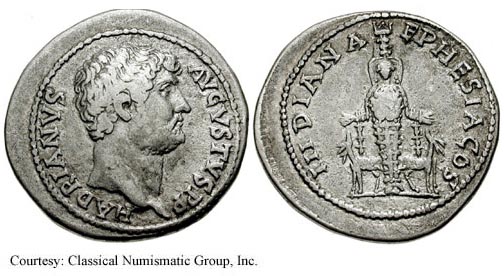 RIC 474 Cistophoric Tetradrachm Obv: HADRIANVSAVGVSTVSPP - Bare head right. Rev: DIANAEPHESIA - Statue of Diana standing, facing, raising hands; deer on either side. c.129-138 (Ephesus). $650 9/24/03. RIC 474v Cistophoric Tetradrachm Obv: HADRIANVSAVGVSTVSPP - Bare head right. Rev: DIANAEPHESIA - Statue of Diana standing, facing, raising hands. c.129-138 (Ephesus). $450 9/24/03. RIC 475a Cistophoric Tetradrachm Obv: HADRIANVSAVGVSTVSPP - Bare head right. Rev: No legend - Temple with four columns, Diana within (Acroteria on roof); DIA NA across fields, EPHESIA in exergue. c.129-138 (Ephesus). $450 9/24/03. RIC 476 Cistophoric Tetradrachm Obv: HADRIANVSAVGVSTVSPP - Bare head right. Rev: No legend - Temple with four columns, Diana within (No acroteria on roof); DIA NA across fields, EPHESIA in exergue. c.129-138 (Ephesus). $475 9/24/03. RIC 482, BMC 1054, C 285 Cistophoric Tetradrachm Obv: HADRIANVSAVGVSTVSPP - Bare-headed, draped bust right. Rev: COSIII - Apollo Citharoedus standing right, holding plectrum and lyre. c.129-138 (Hierapolis). RIC 485, C 323a Cistophoric Tetradrachm Obv: HADRIANVSAVGVSTVSPP - Bare head right. Rev: COSIII - Bacchus standing left, holding oinochoe and thyrsus; panther at feet. 129-138 (Asia). $600 5/21/03. RIC 486, C 321 Cistophoric Tetradrachm Obv: HADRIANVSAVGVSTVSPP - Bare head right. Rev: COSIII - Ceres standing right, holding scepter; star in right field. c.129-138 (Sardis). $180 9/24/03. RIC 489, BMC 1061, Metcalf 88 Cistophoric Tetradrachm Obv: HADRIANVSAVGVSTVSPP - Bare head right. Rev: COSIII - Cult Statue of Ephesian Artemis facing front, hands extended, stags left and right. c.128-138. RIC 490v, BMC 1062, Metcalf 114, C 317 Cistophoric Tetradrachm Obv: HADRIANVSAVGVSTVSPP - Bare-headed, draped bust right. Rev: COSIII - Diana standing, facing, holding patera and bow; deer to left. [RIC lists for bare head right]. c.128-138 (Miletus). RIC 496, Metcalf 86a, C 276a Cistophoric Tetradrachm Obv: HADRIANVSAVGVSTVSPP - Bare head right. Rev: COSIII - Jupiter standing facing, holding axe and scepter. c.128-138 (Mylasa). RIC 497, BMC 1066, C 275 Cistophoric Tetradrachm Obv: HADRIANVSAVGVSTVSPP - Bare head right. Rev: COSIII - Jupiter standing left, holding eagle and scepter. c.128-138 (Laodicea ad Mare). RIC 499 Cistophoric Tetradrachm Obv: HADRIANVSAVGVSTVSPP - Bare head right. Rev: COSIII - Jupiter seated left, holding Victory and scepter. c.128-138 (Laodicea ad Mare). RIC 503, Metcalf 400, C 294 Cistophoric Tetradrachm Obv: HADRIANVSAVGVSTVSPP - Bare head right. Rev: COSIII - Minerva standing left, holding patera and spear with shield. $276 9/25/03. RIC 507, BMC 1054, Metcalf 143, C 326 Cistophoric Tetradrachm Obv: HADRIANVSAVGVSTVSPP - Bare head right. Rev: COSIII - Two Nemeses standing, facing each other, raising skirt; Nemesis on left holding bridle and one on right holding a rule. c.128-138 (Smyrna). $518 5/21/04. RIC 510 Cistophoric Tetradrachm Obv: HADRIANVSAVGVSTVSPP - Bare head right. Rev: COSIII - Cult statue of Persian Artemis flanked by grain ears and poppy. c.129-138 (Sardis). $420 9/24/03. RIC 511, Metcalf 103, C 347f Cistophoric Tetradrachm Obv: HADRIANVSAVGVSTVSPP - Laureate head right. Rev: COSIII - Roma seated left, holding Victory and scepter. 129-138 (Asia). $300 5/21/03. RIC 512, Metcalf 181, C 327a Cistophoric Tetradrachm Obv: HADRIANVSAVGVSTVSPP - Bare head right. Rev: COSIII - Aphrodisias standing right, raising hands; lion-headed censer to left, Cupid seated left on right. 128-138 (Aphrodisias). RIC 518, C 441 Cistophoric Tetradrachm Obv: HADRIANVSAVGVSTVSPP - Laureate head right. Rev: COSIII - Grain ears. 129-138 (Asia). $800 5/19/04. RIC 527, C 539 Cistophoric Tetradrachm Obv: HADRIANVSAVGVSTVSPP - Bare head right. Rev: DIANAEPHESIACOS - Statue of Diana standing, facing, raising hands; deer on either side. c.129-138 (Ephesus). $500 9/24/03. RIC 530v Cistophoric Tetradrachm Obv: AVGVSTVSHADRIANVSPP - Bare head right. Rev: FORTVAVGVS - Fortuna standing left, holding rudder and cornucopia. $276 9/25/03. Unlisted RIC, C 275a Cistophoric Tetradrachm Obv: HADRIANVSAVGVSTVSPP - Bare head right. Rev: COSIII - Jupiter standing left, holding eagle and scepter. c.128-138 (Aezani). $228 9/24/03. Unlisted RIC, Metcalf 324, C 374 Cistophoric Tetradrachm Obv: HADRIANVSAVGVSTVSPP - Bare head right. Rev: COSIII - Fortuna standing left, holding rudder and cornucopia.