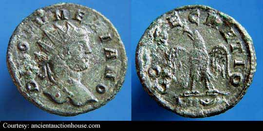 RIC 424, C 10 Antoninianus Obv: DIVONVMERIANO - Radiate head right. Rev: CONSECRATIO - Eagle standing to the front, its head turned left and wings spread, the tips of which are pointed downward. 284-285 (Rome). $21 2/25/03.