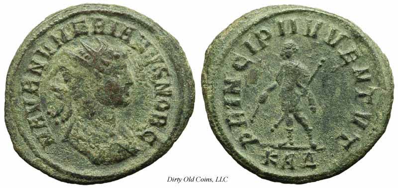 RIC 373, Calico 4303 Aureus Obv: IMPCMAVRNVMERIANVSNOBC - Laureate, draped and cuirassed bust right. Rev: CONSERVATAVGGG Exe: SMA - Sol standing left, raising hand and holding globe. 283 (Antioch).