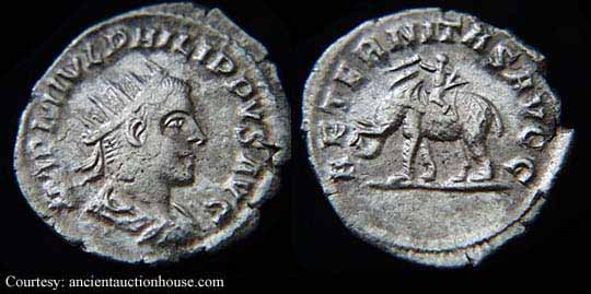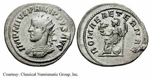 RIC 215 (Philip I), C 32 Antoninianus Obv: MIVLPHILIPPVSCAES - Radiate, draped bust right. Rev: PIETASAVGVSTOR - Sacrificial implements. 245 (Rome). RIC 216c (Philip I), C 54 Antoninianus Obv: MIVLPHILIPPVSCAES - Radiate, draped and cuirassed bust right. Rev: PRINCIPIIVVENT - Philip II standing right, holding spear and globe. 245 (Rome). RIC 217 (Philip I), C 58 Antoninianus Obv: MIVLPHILIPPVSCAES - Radiate, draped and cuirassed bust right. Rev: PRINCIPIIVVENT - Philip II standing right, holding spear and globe; accompanied by soldier. 246 (Rome). RIC 217 (Philip I), C 59 Antoninianus Obv: MIVLPHILIPPVSCAES - Radiate, draped and cuirassed bust right. Rev: PRINCIPIIVVENT - Philip II standing right, holding spear and globe; accompanied by soldier holding spear. 246 (Rome). RIC 217v (Philip I) Antoninianus Obv: MIVLPHILIPPVSCAES - Radiate, draped and cuirassed bust right. Rev: PRINCIPIIVVENT - Philip II standing right, holding spear and parazonium; accompanied by soldier. 246 (Rome). RIC 218d (Philip I), C 48 Antoninianus Obv: MIVLPHILIPPVSCAES - Radiate, draped and cuirassed bust right. Rev: PRINCIPIIVVENT - Philip II standing left, holding globe and spear. 246 (Rome). RIC 219 (Philip I), C 57 Antoninianus Obv: MIVLPHILIPPVSCAES - Radiate, draped and cuirassed bust right. Rev: PRINCIPIIVVENT - Philip II standing left, holding globe and spear; seated captive to left. $20 12/24/01. RIC 220b (Philip I), C 61 Antoninianus Obv: MIVLPHILIPPVSCAES - Radiate, draped bust right. Rev: PRINCIPIIVVENT - Philip II standing left, holding standard and spear. RIC 221 (Philip I), C 84 Antoninianus Obv: MIVLPHILIPPVSCAES - Radiate, draped bust right. Rev: SPESPVBLICA - Spes advancing left, holding flower and raising skirt. RIC 224 (Philip I), C 72 Antoninianus Obv: IMPPHILIPPVSAVG - Radiate, draped and cuirassed bust right. Rev: SAECVLARESAVGG Exe: III - Goat advancing left. 248 (Rome). RIC 224v (Philip I) Antoninianus Obv: IMPPHILIPPVSAVG - Radiate, draped and cuirassed bust right. Rev: SAECVLARESAVGG Exe: III - Goat advancing right. 248 (Rome). RIC 226 (Philip I), C 6 Antoninianus Obv: IMPMIVLPHILIPPVSAVG - Radiate, draped and cuirassed bust right. Rev: AETERNITIMPER - Sol advancing left, raising hand and holding whip. 246-247 (Rome). RIC 227 (Philip I) Antoninianus Obv: IMPMIVLPHILIPPVSAVG - Radiate, draped and cuirassed bust right. Rev: PAXAETERNA - Pax standing left, holding branch and scepter. 247 (Rome). RIC 230 (Philip I), C 17 Antoninianus Obv: IMPPHILIPPVSAVG - Radiate, draped and cuirassed bust right. Rev: LIBERALITASAVGIII - Philip I and Philip II seated left. 249 (Rome). RIC 231c (Philip I), C 23 Antoninianus Obv: IMPPHILIPPVSAVG - Radiate, draped and cuirassed bust right. Rev: PAXAETERNA - Pax standing left, holding branch and scepter. RIC 232 (Philip I) Antoninianus Obv: IMPMIVLPHILIPPVSAVG - Radiate, draped and cuirassed bust right. Rev: PMTRPIIIICOSPP - Felicitas standing left, holding caduceus and cornucopia. 247 (Antioch). RIC 233 (Philip I), C 34 Antoninianus Obv: IMPMIVLPHILIPPVSAVG - Radiate, draped and cuirassed bust right. Rev: PMTRPIIIICOSIIPP - Felicitas standing left, holding caduceus and cornucopia. 247 (Antioch). $78 4/17/03. RIC 233v (Philip I), C 34 Antoninianus Obv: IMPMIVLPHILIPPVSAVG - Radiate, draped and cuirassed bust left. Rev: PMTRPIIIICOSIIPP - Felicitas standing left, holding caduceus and cornucopia. [RIC unlisted bust type for this issue]. 247 (Antioch). RIC 235 (Philip I) Antoninianus Obv: IMPMIVLPHILIPPVSAVG - Radiate, draped and cuirassed bust right. Rev: PMTRPVICOSPP - Felicitas standing left, holding caduceus and cornucopia. 247 (Antioch). $48 6/4/03. RIC 235v (Philip I) Antoninianus Obv: IMPMIVLPHILIPPVSAVG - Radiate, draped and cuirassed bust left. Rev: PMTRPVICOSPP - Felicitas standing left, holding caduceus and cornucopia. 247 (Antioch). RIC 236 (Philip I) Antoninianus Obv: IMPMIVLPHILIPPVSAVG - Radiate, draped and cuirassed bust right. Rev: PMTRPVICOSPP - Philip II standing left, sacrificing over altar and holding scepter. 249 (Antioch). RIC 238 Antoninianus Obv: IMPMIVLPHILIPPVSAVG - Radiate, draped and cuirassed bust left. Rev: PMTRPVICOSPP - Radiate lion advancing right, thunderbolt in jaws. RIC 239 Antoninianus Obv: IMPMIVLPHILIPPVSAVG - Radiate, draped and cuirassed bust left. Rev: PMTRPVICOSPP - Radiate lion advancing left, thunderbolt in jaws. $245 9/25/02. RIC 240a (Philip I) Antoninianus Obv: IMPMIVLPHILIPPVSAVG - Radiate, draped and cuirassed bust right. Rev: AEQVITASAVGG - Aequitas standing left, holding scales and cornucopia. 247-249 (Antioch). $135 8/29/03. RIC 240v (Philip I) Antoninianus Obv: IMPMIVLPHILIPPVSAVG - Radiate, draped and cuirassed bust right. Rev: AEQVITASAVG - Aequitas standing left, holding scales and cornucopia. [RIC lists for reverse legend AEQVITAS AVGG]. 247-249 (Antioch). $46 3/24/03. RIC 240v (Philip I) Antoninianus Obv: IMPPHILIPPVSAVG - Radiate, draped and cuirassed bust right. Rev: AEQVITASAVG - Aequitas standing left, holding scales and cornucopia. [RIC lists for obverse legend IMP M IVL PHILIPPVS AVG]. 247-249 (Antioch). RIC 241 (Philip I) Antoninianus Obv: IMPMIVLPHILIPPVSAVG - Radiate, draped and cuirassed bust right. Rev: CONCORDIAAVGG - Concordia seated left, holding patera and cornucopia. $106 4/11/03. RIC 243 (Philip I) Antoninianus Obv: IMPMIVLPHILIPPVSAVG - Radiate, cuirassed bust left. Rev: ROMAEAETERNAE - Roma seated left, holding Victory and spear. RIC 244 (Philip I), C 8 Antoninianus Obv: IMPMIVLPHILIPPVSAVG - Radiate, draped and cuirassed bust right. Rev: SAECVLVMNOVVM - Temple with six columns;Roma within. 247-249 (Antioch). RIC 246a (Philip I), C 5 Antoninianus Obv: IMPMIVLPHILIPPVSAVG - Radiate, draped and cuirassed bust right. Rev: AETERNITASAVGG - Elephant advancing left, with rider. 249 (Antioch). $127 2/9/03. Unlisted Antoninianus Obv: IMPMIVLPHILIPPVSAVG - Radiate, draped and cuirassed bust right. Rev: SAECVLARESAVGG - Cippus reading COS/III. c.248 (Antioch). $700 9/24/03. Unlisted Antoninianus O