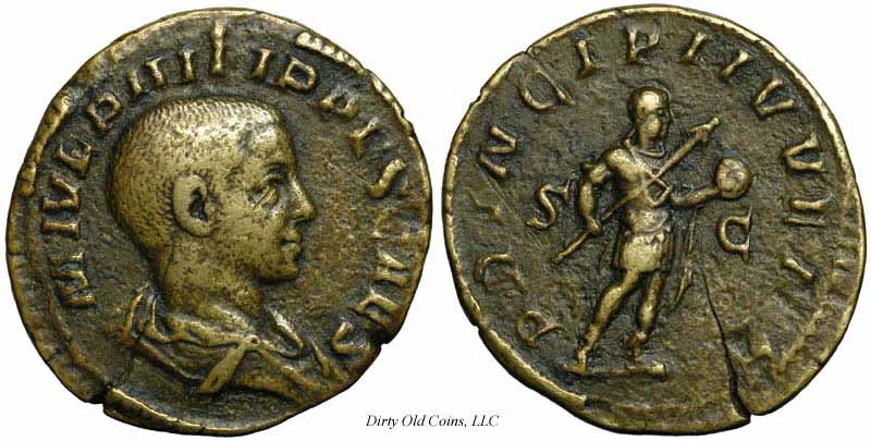 RIC 256a (Philip I), C 49 As Obv: MIVLPHILIPPVSCAES - Bare-headed, draped bust right. Rev: PRINCIPIIVVENT - Philip II standing left, holding globe and spear. 244-247 (Rome). RIC 258a (Philip I), C 62 As Obv: MIVLPHILIPPVSCAES - Bare-headed, draped bust right. Rev: PRINCIPIIVVENTVTIS - Philip II standing left, holding standard and spear. 244-246 (Rome). $13 9/27/03. Unlisted As Obv: IMPPHILIPPVSAVG - Laureate, draped and cuirassed bust right. Rev: PMTRPIIIICOSIIPP Exe: SC - Philip II seated left, holding globe and scepter. [RIC 262b as Dupondius]. 247 (Rome).