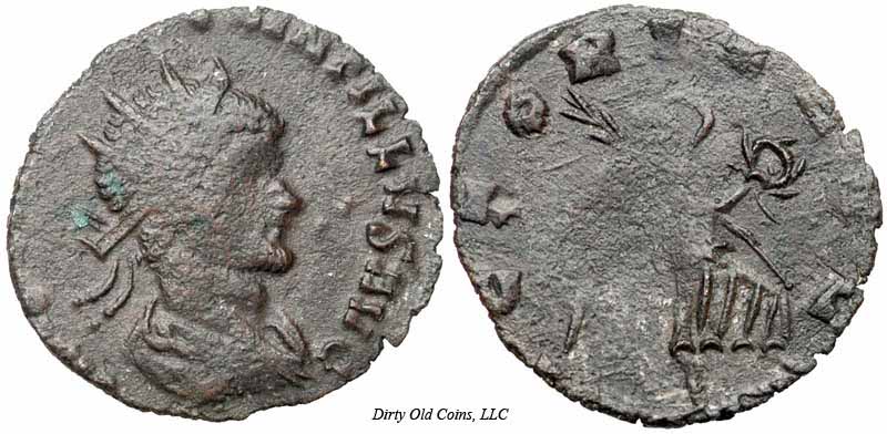 RIC 7, C 2 Antoninianus Obv: IMPCMAVRCLQVINTILLVSAVG - Radiate, draped bust right. Rev: AETERNITAVG - Aeternitas standing left, raising hand and holding globe.