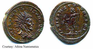RIC 9 Antoninianus Obv: IMPCMAVRCLQVINTILLVSAVG - Radiate, draped bust right. Rev: APOLLINICONS - Apollo standing left, holding branch and resting hand on lyre on rock. 270 (Rome). $37 3/7/04. RIC 13a, Giard 10052 Antoninianus Obv: IMPCMAVRCLQVINTILLVSAVG - Radiate, draped bust right. Rev: CONCORDIAAVG - Concordia standing left, sacrificing over altar and holding double cornucopia. 270 (Rome). RIC 18, C 28 Antoninianus Obv: IMPCMAVRCLQVINTILLVSAVG - Radiate, draped bust right. Rev: FIDESMILITVM - Fides standing left, holding standard and spear. 270 (Rome). RIC 22a, Giard 10249 Antoninianus Obv: IMPCMAVRCLQVINTILLVSAVG - Radiate, draped bust right. Rev: LAETITIAAVG - Laetitia standing left, holding wreath and rudder. 270 (Rome). RIC 24a, C 49 Antoninianus Obv: IMPCMAVRCLQVINTILLVSAVG - Radiate, draped bust right. Rev: MARTIPACIF - Mars advancing left, holding branch and spear with shield. $200 9/19/01. RIC 26 Antoninianus Obv: IMPCMAVRCLQVINTILLVSAVG - Radiate, draped bust right. Rev: PAXAVGVSTI - Pax standing left, holding branch and scepter. 270 (Rome). RIC 29, C 61 Antoninianus Obv: IMPCMAVRCLQVINTILLVSAVG - Radiate, draped bust right. Rev: PROVIDENTAVG - Providentia standing left, holding wand over globe and scepter. $66 9/25/02. RIC 31, Giard 10209, C 63 Antoninianus Obv: IMPCMAVRCLQVINTILLVSAVG - Radiate, drapeed bust right. Rev: SECVRITAVG - Securitas standing left, leaning on column and with legs crossed, holding scepter. RIC 33, C 70 Antoninianus Obv: IMPCMAVRCLQVINTILLVSAVG - Radiate, draped bust right. Rev: VICTORIAAVG - Victory advancing right, holding wreath and palm. RIC 35, C 73 Antoninianus Obv: IMPCMAVRCLQVINTILLVSAVG - Radiate, draped bust right. Rev: VIRTVSAVG - Virtus standing, holding shield and scepter. 270 (Rome). $87 2/15/03. RIC 49v, Normanby 1220 Antoninianus Obv: IMPQVINTILLVSAVG - Radiate, draped bust right. Rev: DIANALVCIF - Diana standing right, holding torch with both hands. 270 (Mediolanum). $229 8/18/02. RIC 52a, C 25 Antoninianus Obv: IMPQVINTILLVSAVG - Radiate, draped bust right. Rev: FIDESMILIT - Fides standing, facing, holding standard in each hand. 270 (Mediolanum). $13 6/12/04. RIC 54, C 33 Antoninianus Obv: IMPQVINTILLVSAVG - Radiate, draped bust right. Rev: FORTVNAERED - Fortuna standing left, holding rudder on globe and cornucopia. RIC 58a, C 47 Antoninianus Obv: IMPQVINTILLVSAVG - Radiate, draped bust right. Rev: MARTIPAC - Mars standing left, holding spear and branch. $250 3/26/02. RIC 76f(var.), C 68 Antoninianus Obv: IMPCMAVRCLQVINTILLVSAVG - Radiate, cuirassed bust right. Rev: TEMPORVMFELI Exe: P - Felicitas standing left, holding caduceus and cornucopia. [RIC unlisted bust type and exergue marking for this issue]. 270 (Siscia). RIC 78f Antoninianus Obv: IMPCMAVRQVINTILLVSAVG - Radiate, cuirassed bust right. Rev: VBERITASAVG - Uberitas standing left, holding purse and cornucopia. RIC 82, C 27 Antoninianus Obv: IMPQVINTILLVSPFAVG - Laureate, draped bust right. Rev: FIDESMILITVM - Fides standing left, holding standard and spear. 270 (Cyzicus). $17 12/2/02. RIC 83c Antoninianus Obv: IMPQVINTILLVSPFAVG - Radiate, draped and cuirassed bust right with three dots below. Rev: FORTVNAREDVX - Fortuna standing left, holding rudder on globe and cornucopia. 270 (Cyzicus). RIC 84, C 36 Antoninianus Obv: IMPQVINTILLVSPFAVG - Radiate, draped and cuirassed bust right. Rev: IOVICONSERVATORI - Jupiter standing left, holding thunderbolt and scepter. Unlisted Antoninianus Obv: IMPCMAVRCLQVINTILLVSAVG - Radiate, draped bust right. Rev: PROVIDAVG - Providentia standing left, holding wand over globe and scepter. CNG 69 #1694 Antoninianus Obv: IMPQVINTILLVSAVG - Radiate, draped bust right. Rev: MARTIPACI Exe: P - Mars standing left, holding branch and spear. 270 (Mediolanum).