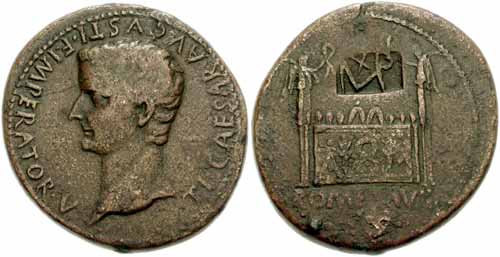 RIC 90 Dupondius Obv: TICAESARDIVIAVGVSTIFAVGVSTVS - Laureate head right. Rev: PONTMAXIMCOSIIIIMPVIITRPOTXXI - Crossed cornucopia, winged caduceus within. 19-21 (Commagene). RIC 90v Dupondius Obv: TICAESARDIVIAVGVSTIFAVGVTVS - Laureate head right. Rev: PONTMAXIMCOSIIIIMPVIITRPOTXXI - Crossed cornucopia, winged caduceus within. [As RIC 90 but obverse legend missing first first S in AVGVSTVS]. 19-21 (Commagene). RIC 236a Dupondius Obv: TICAESARAVGVSTFIMPERATV - Laureate head right. Rev: No legend Exe: ROMETAVG - Altar with two Victories. c.8-10 (Lugdunum).