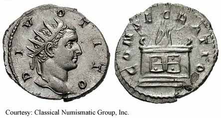 RIC 85b, C 566 Antoninianus, Trajan Commemorative Obv: DIVOTRAIANO - Radiate head right, draped left shoulder. Rev: CONSECRATIO - Eagle.