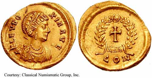 RIC 21 (X, Arcadius) Tremissis Obv: AELEVDOXIAAVG - Diademed, draped bust right.