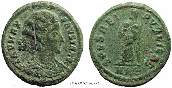 RIC 161 (Thessalonica), LRBC 827 AE3 Obv: FLAVMAXFAVSTAAVG - Bare-headed bust right, wearing necklace.